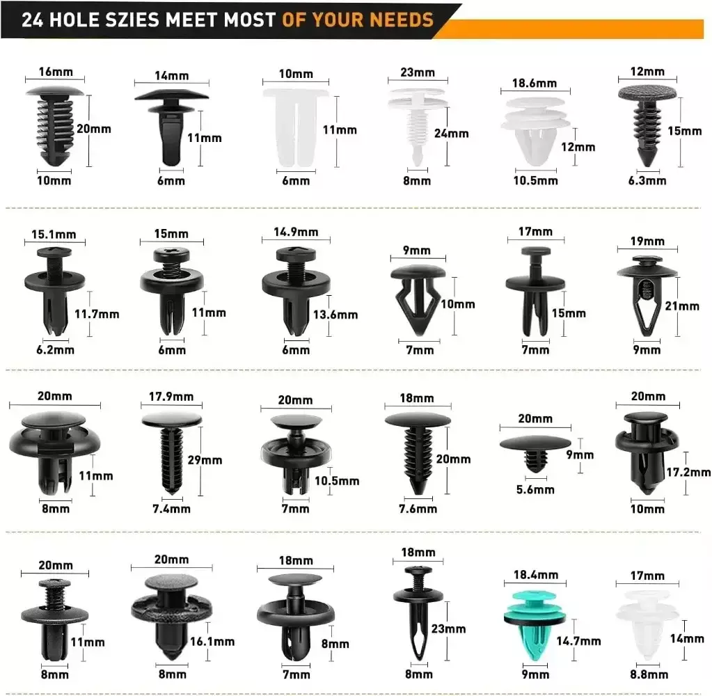 -Esses clipes de pressão são amplamente utilizados para clipes de painel de acabamento, clipes de acabamento de porta, clipes de painel de porta, clipes de pára-choques, clipes de pára-lama, tampa do motor e substituição de retentores de proteção contra respingos.Loja interessante para automóveis. Sempre cobre algumas aplicações, incluindo equipamentos de telecomunicações, veículos motorizados, eletrodomésticos, móveis e equipamentos elétricos.