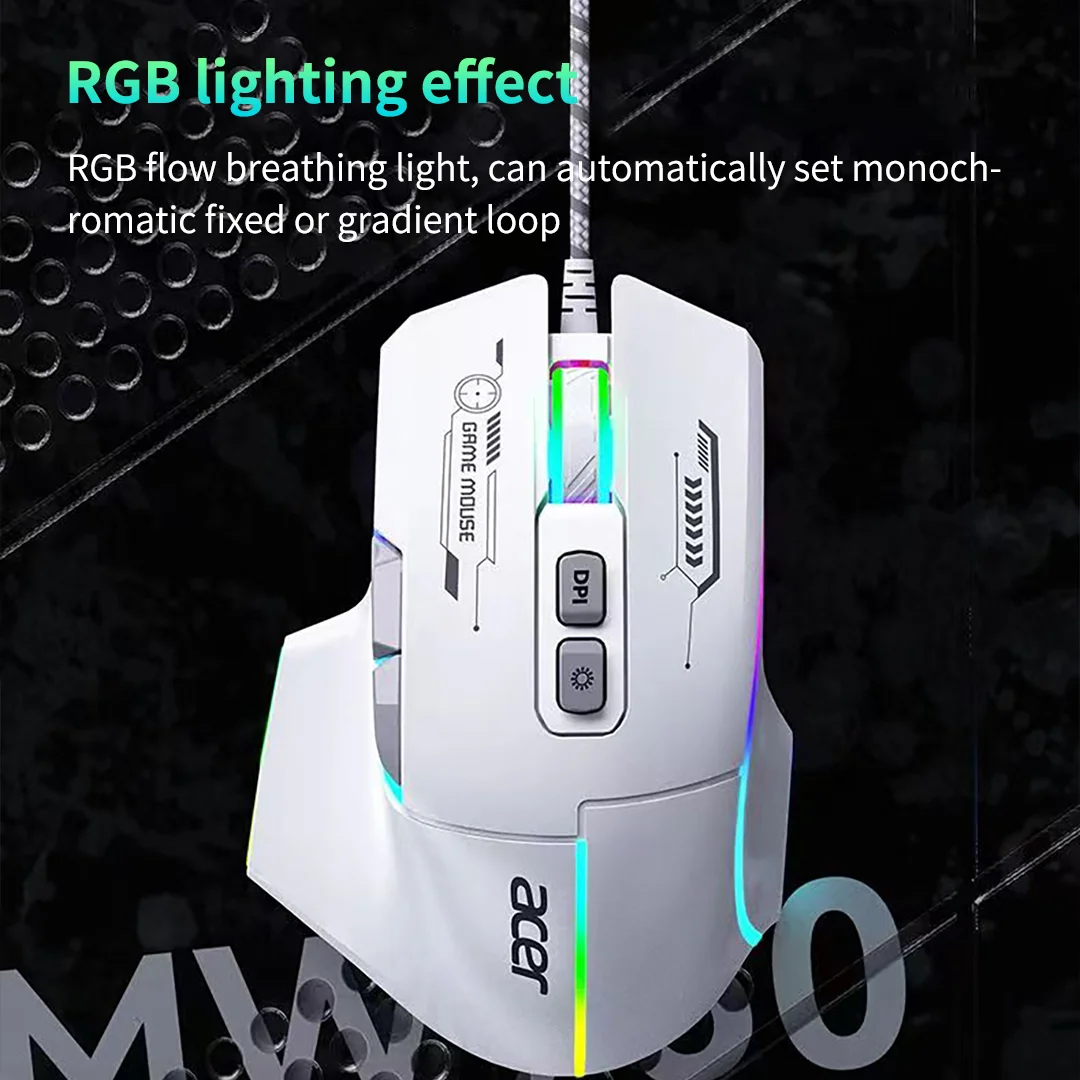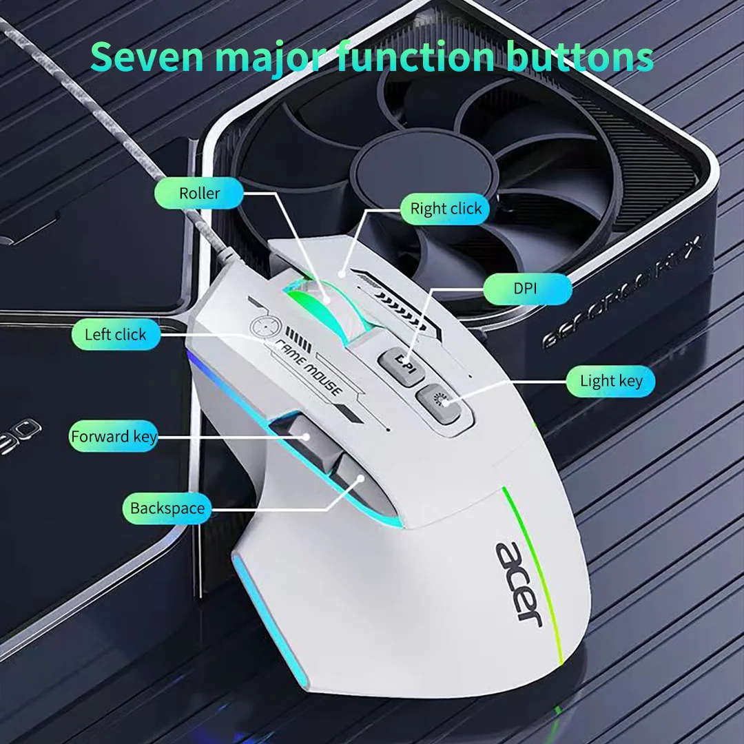 Acer Wired Mouse 7200DPI Ergonômico Macroprogramável Personalizado RGB Efeito de Lâmpada Home Office Gaming Mouse para Desktop Computador Portátil
