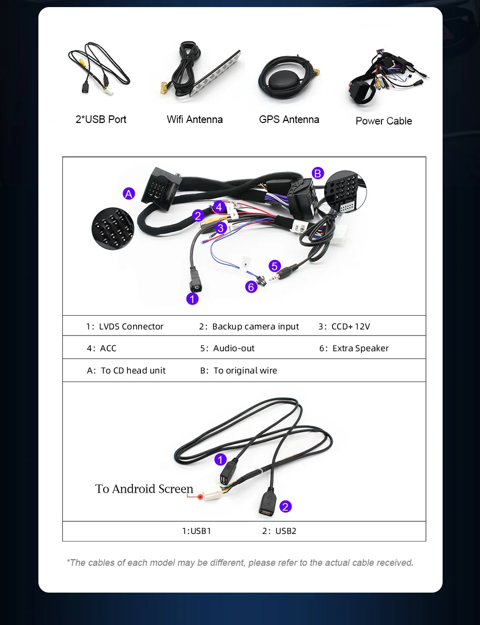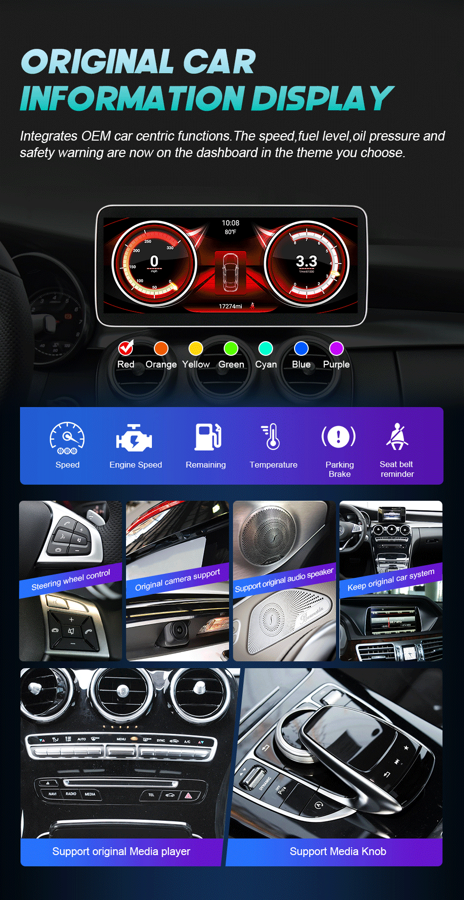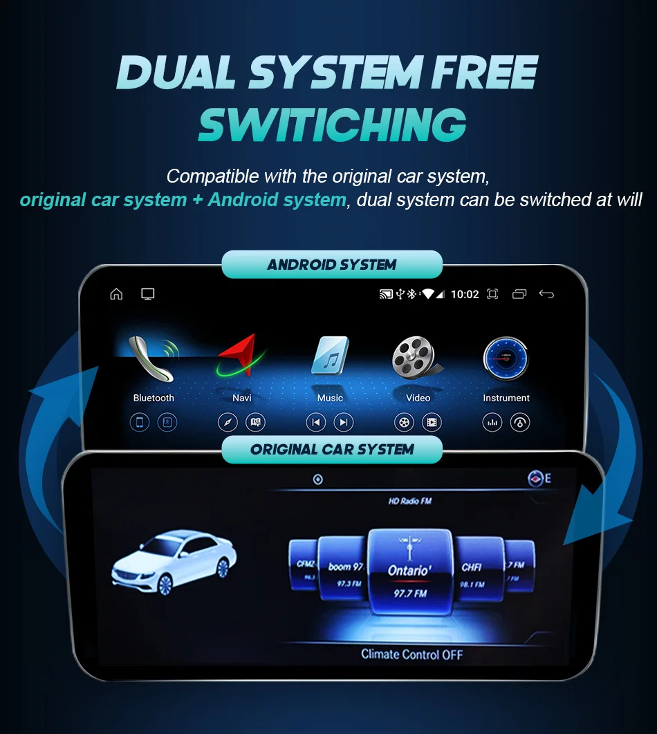 – Sistema duplo, OEM e Android, alterne livremente e suporte a funções originais, como exibição de informações do carro, sistema de estacionamento, câmera de visão traseira original, rádio, navegação GPS, Bluetooth, USB, etc.