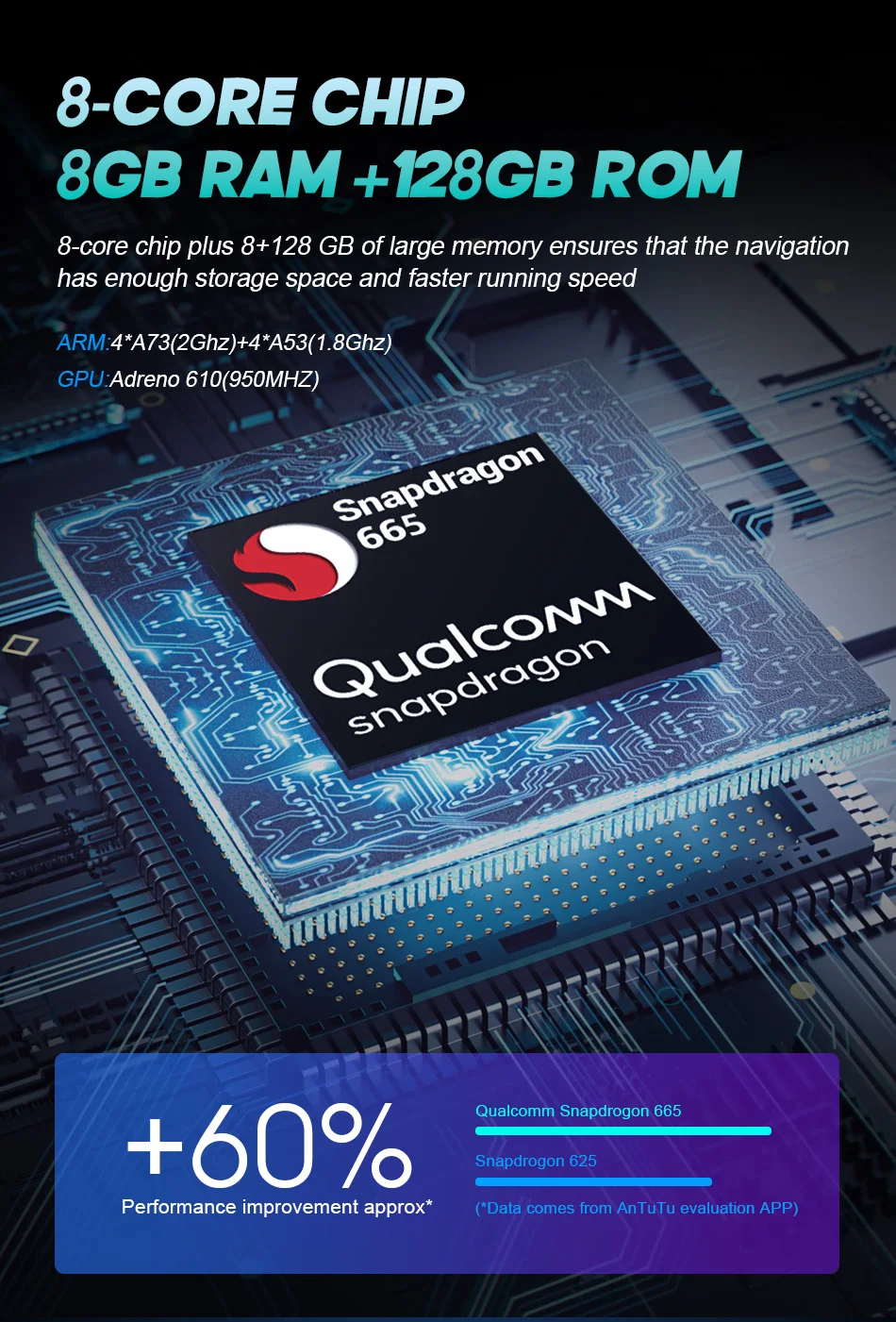 CPU: Qualcomm Snapdragon 665 / MTK 8581 (opção)