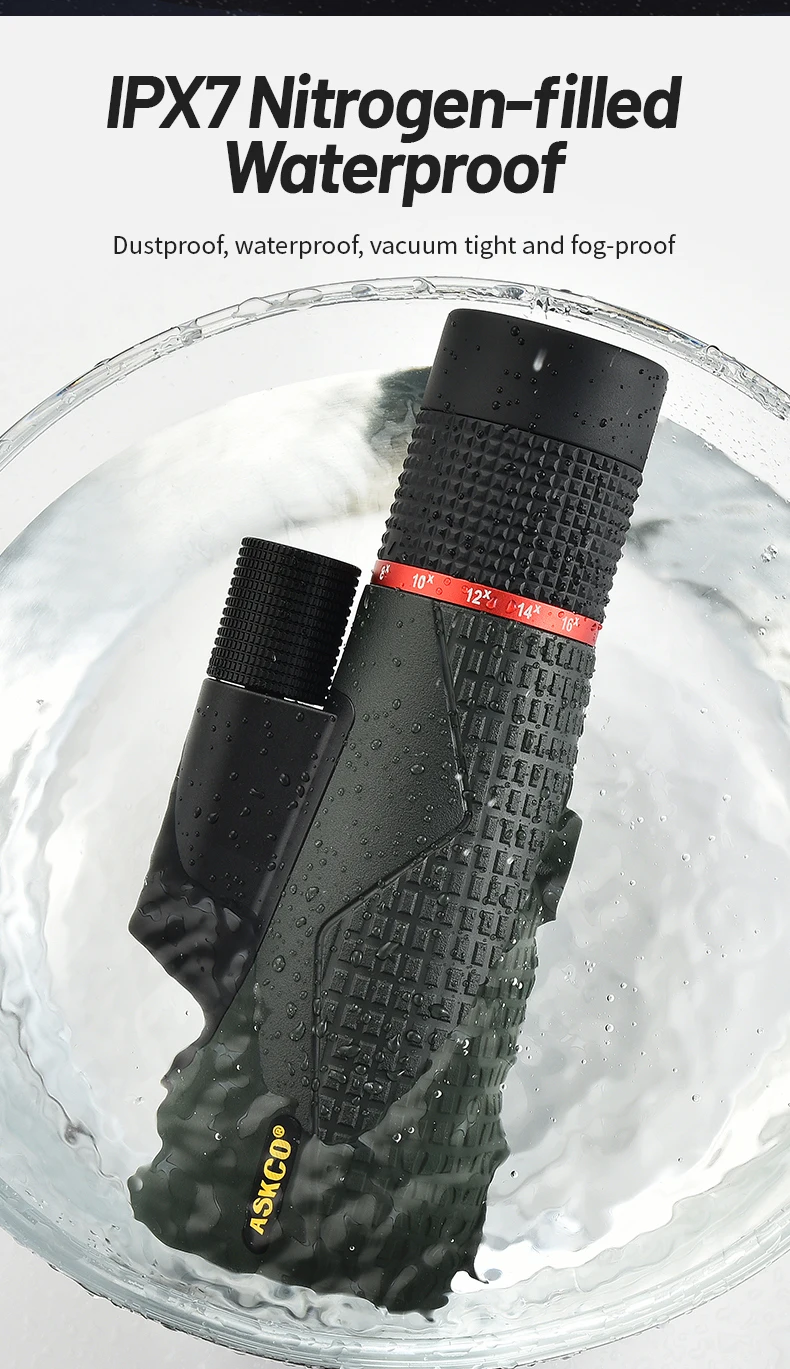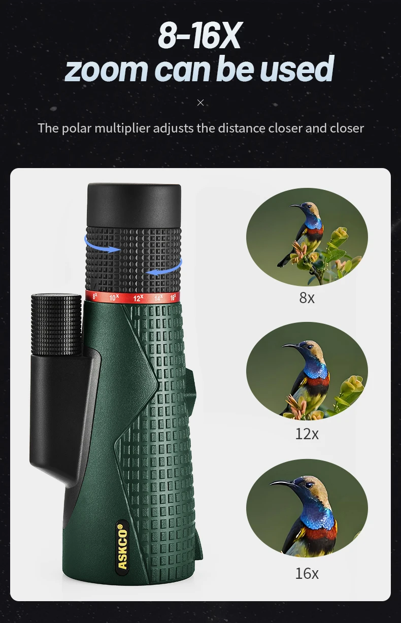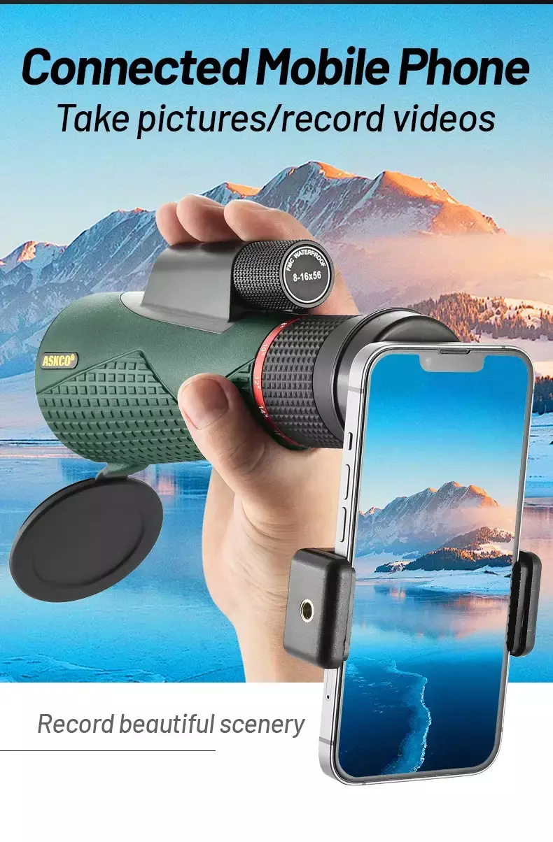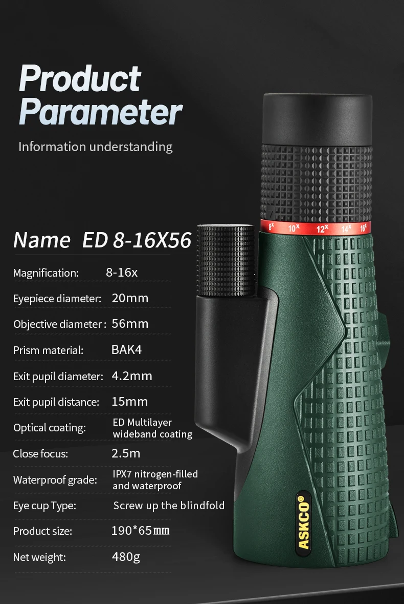 Teescópio monocular de vidro ASKCO 8-16X56 ED com revestimento SMC de longo alcance Binóculos portáteis anti-vibração BAK4 com zoom de longo alcance para caça