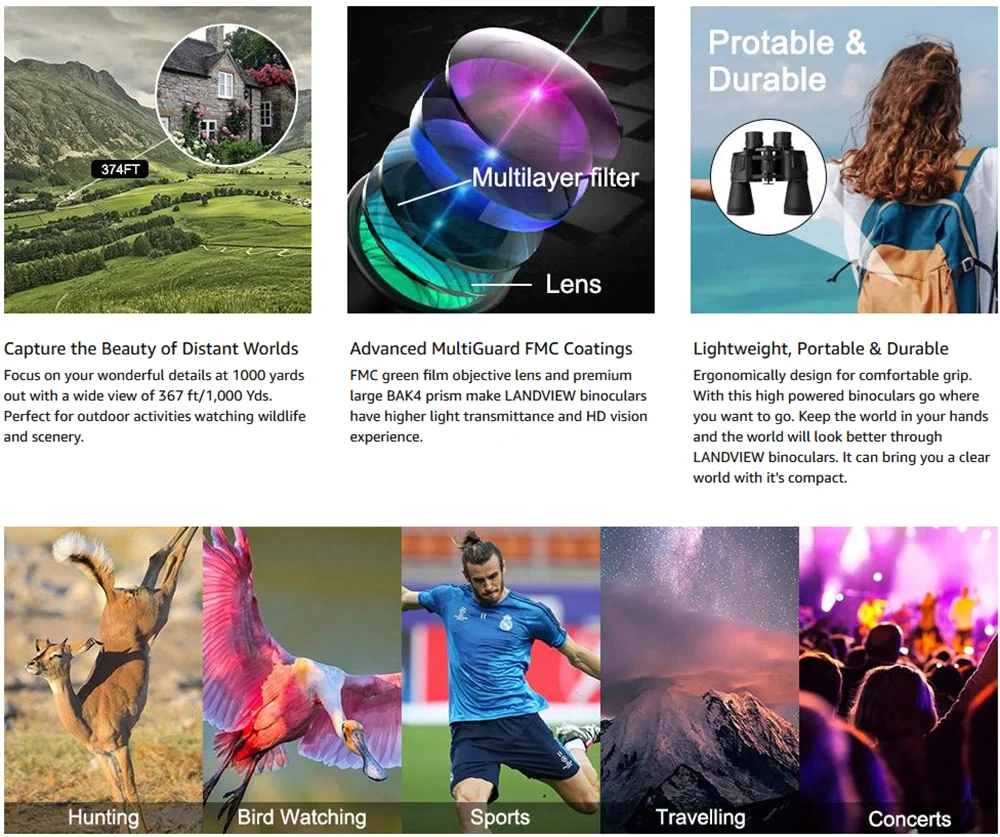 Ampliação de alta potênciaCom ampliação de 20x, binóculos profissionais com lente objetiva de 50 mm para atividades internas e externas.Pareça mais claro, veja mais amplo.