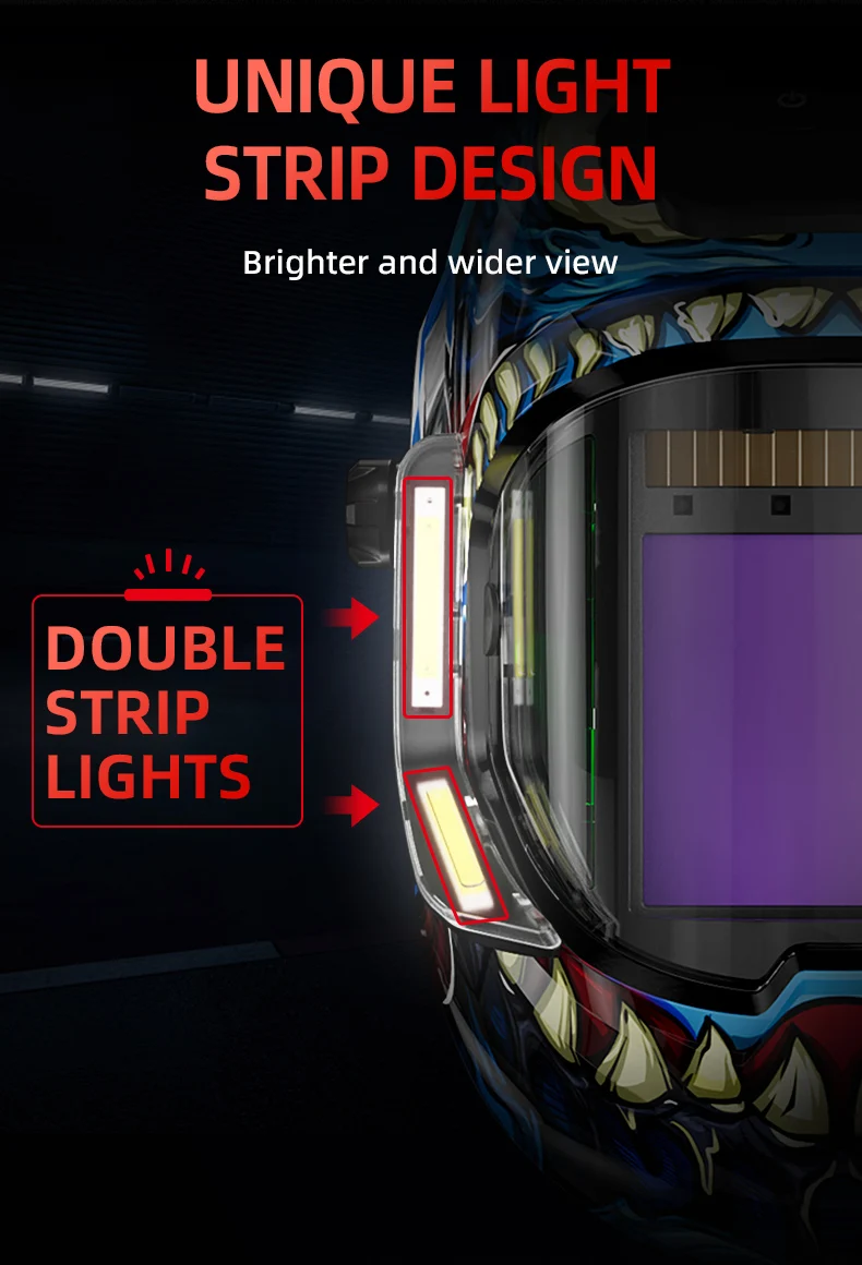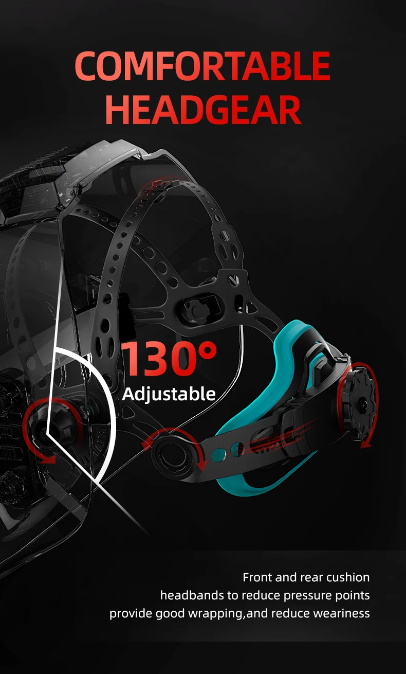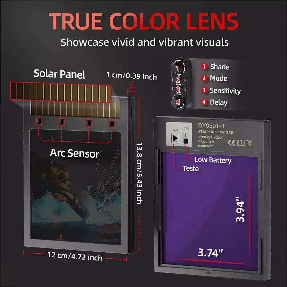 1.180° Tela de visualização grande: Desfrute de uma ampla área de visualização de 3,94 x 3,74 polegadas, com uma visão lateral adicional de 3,72 × 1,76 polegadas (DIN4, sem escurecimento automático).Melhore a precisão e o controle da soldagem com uma faixa de visão completa ao redor da área de soldagem.