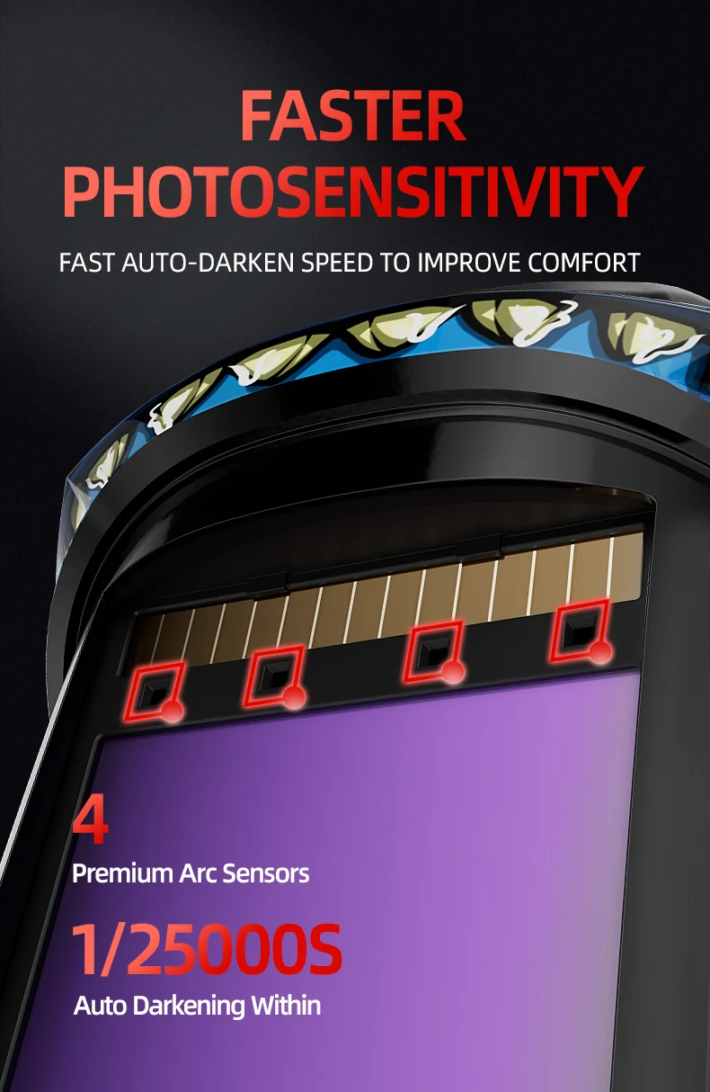 4. Escurecimento automático: Equipado com 4 sensores premium, o capacete muda de claro para escuro em impressionantes 1/25000 segundos, protegendo seus olhos dos raios nocivos durante as operações de soldagem.