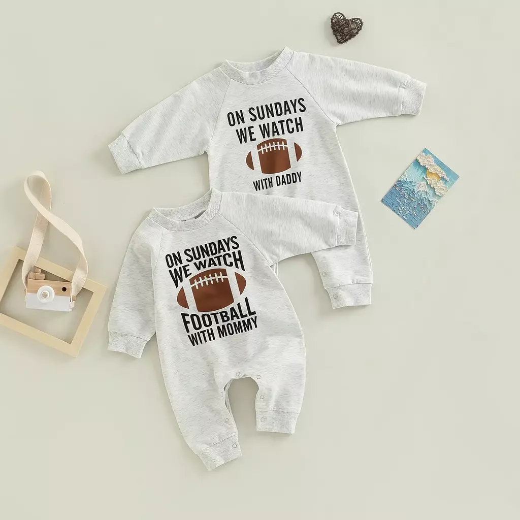 Macacão infantil da primavera do outono do bebê, carta dos desenhos animados rugby impressão manga longa em torno do pescoço macacão de comprimento total para meninos meninas