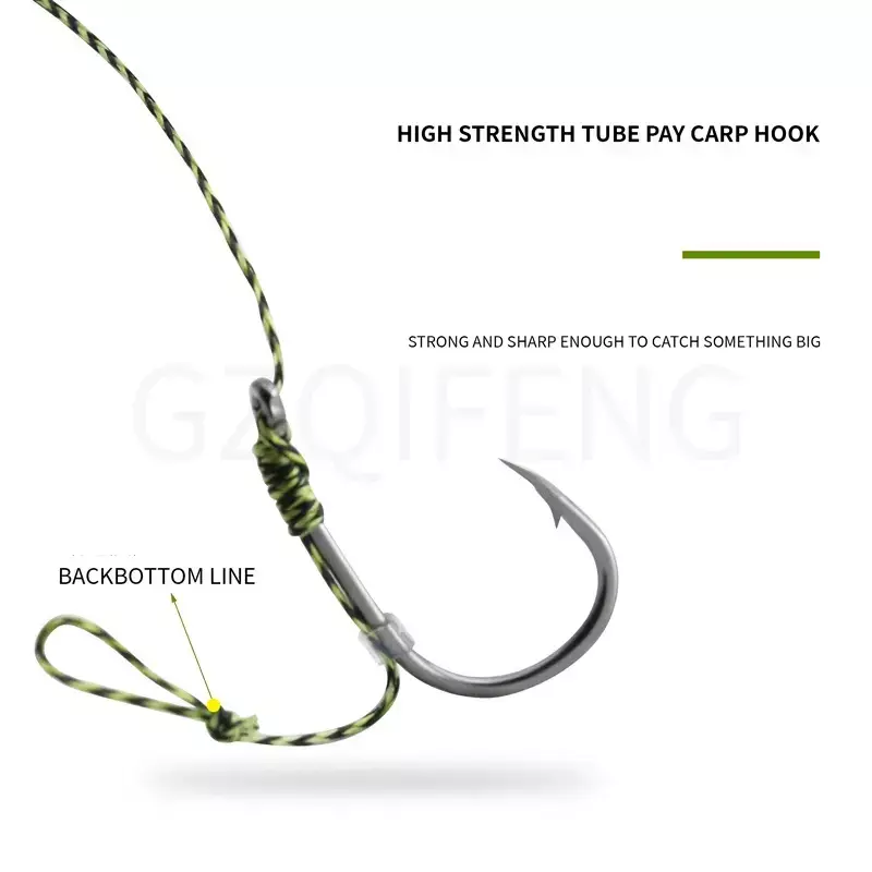 Construção: anel giratório, fixação de tubo termorretrátil, linha trançada, linha de isca de pesca contra-fundo, anzol de carpa