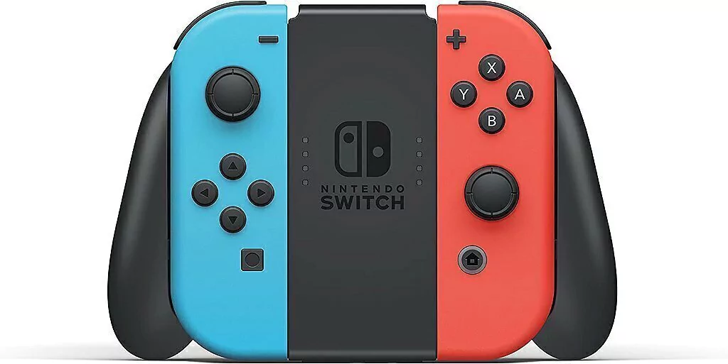O console Nintendo Switch Azul e Vermelho é um dispositivo de jogos híbrido que pode ser jogado em modo portátil, mesa ou TV. Ele vem com um par de Joy-Cons, um controlador destacável que pode ser usado por uma ou duas pessoas, e apresenta um design de cores vibrantes em azul e vermelho.