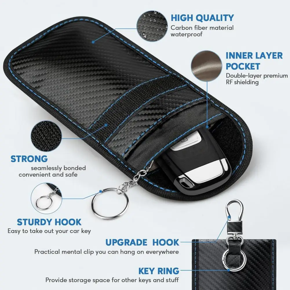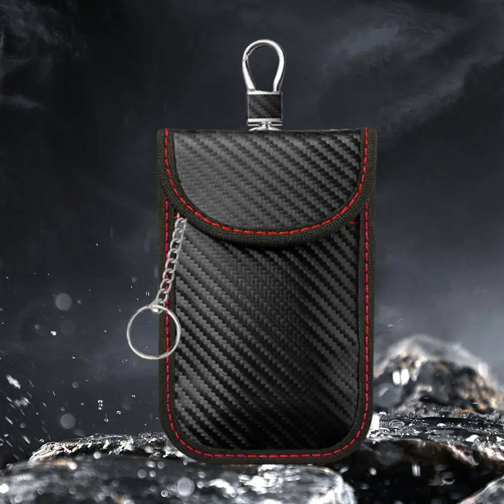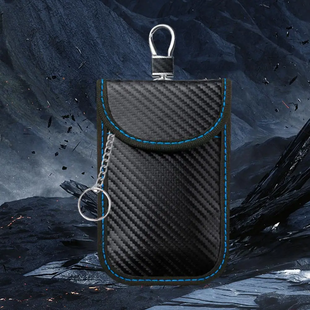 Mantenha a chave do seu carro segura e protegida com nossa prática bolsa para chaves do carro.Fabricada em material de fibra de carbono, esta bolsa para chaves possui um fecho de fita sem costura e um chaveiro para fácil acesso.O tecido de blindagem RFID interno protege os sinais das chaves do seu carro, garantindo a segurança do seu veículo.
