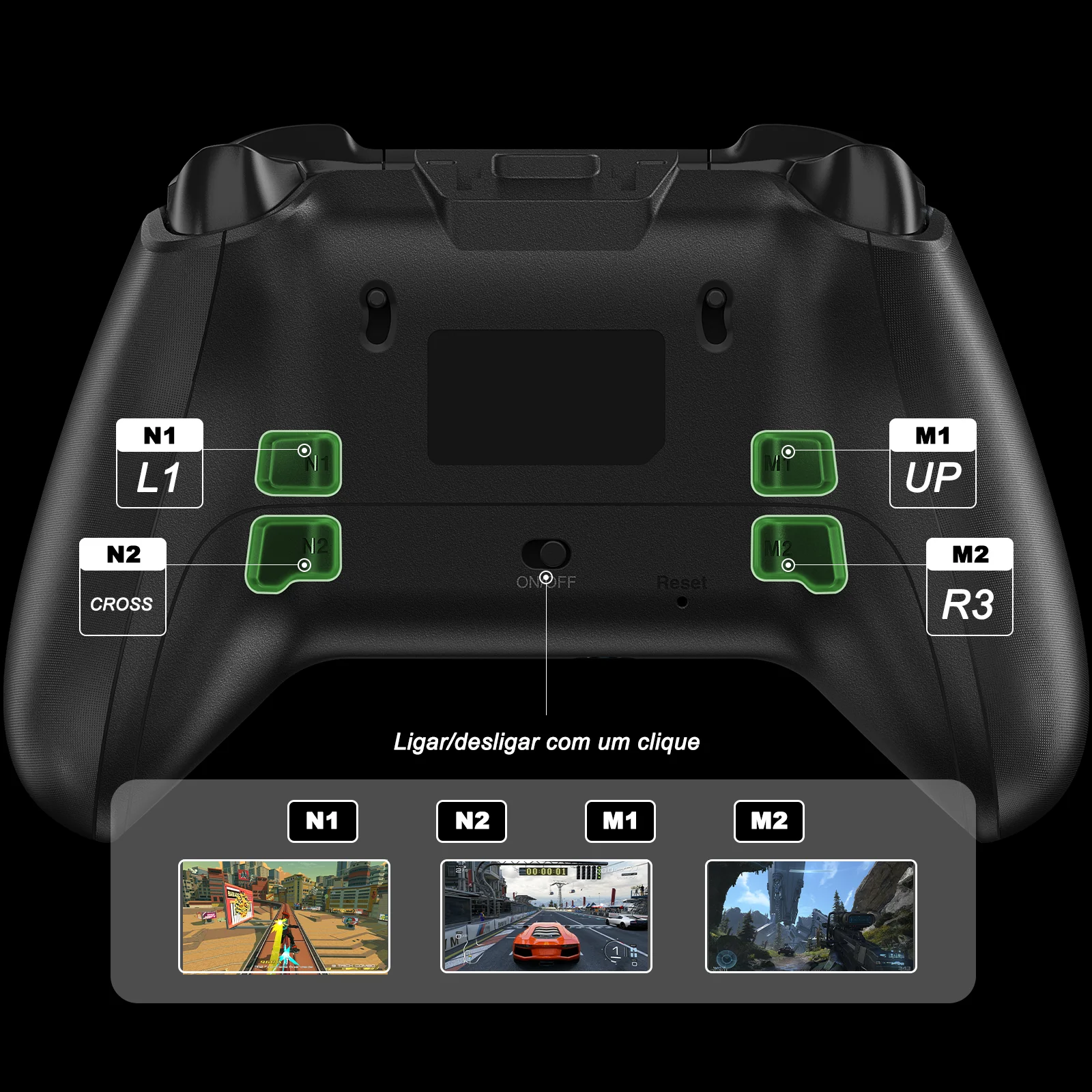 Suporta botões A, B, X, Y, RB, LB, RT, LT e M1–M4 com função Turbo personalizável.Os usuários podem alternar entre os modos Turbo semiautomático e totalmente automático, atendendo a diversos requisitos de jogo.