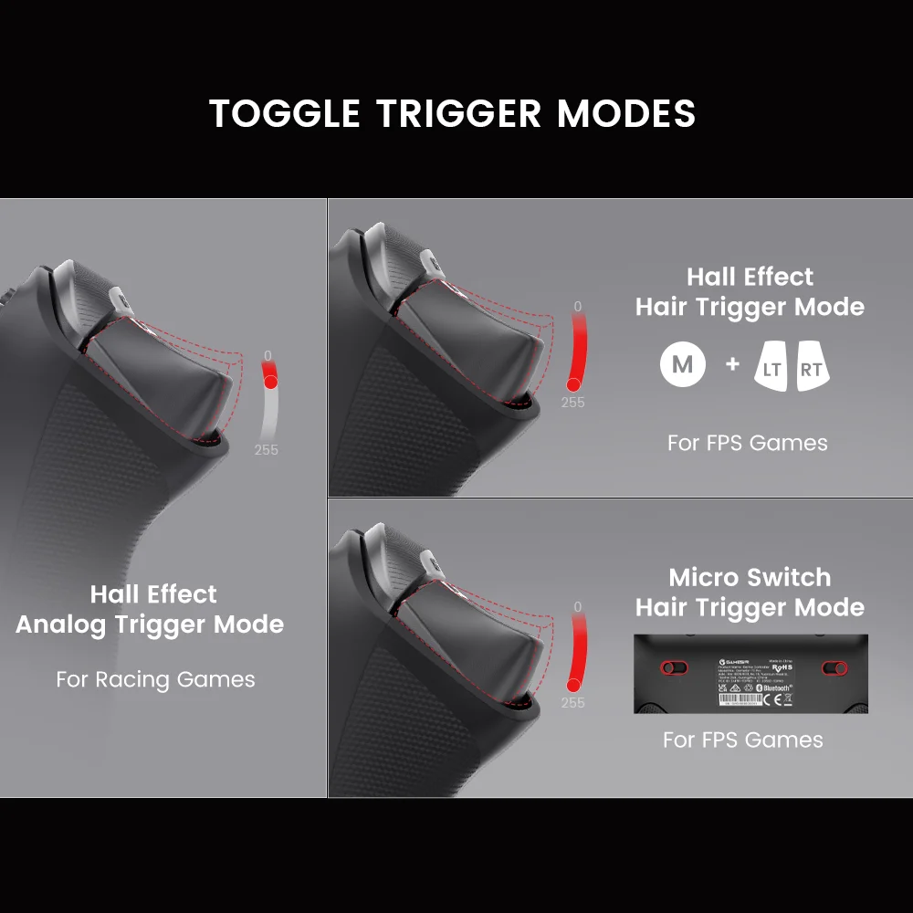 Até 9 botões mapeáveis fornecem controle de nível profissional e um estilo de jogo personalizado.Sem configurações complicadas, os jogadores podem remapear o botão desejado em movimento simplesmente por meio de combinações de teclas para se adequar ao seu esquema de controle preferido.Além disso, o indicador RGB Home, a faixa de luz e os botões faciais oferecem efeitos de iluminação personalizáveis, incluindo saturação, velocidade de animação e opções de cores.A trava do botão Voltar permite aos jogadores ativar ou desativar o botão Voltar, garantindo controle conveniente ou evitando entradas não direcionadas.Ao segurar a combinação de teclas, o mecanismo de engrenagem do botão facial girará para alterar o layout dos botões faciais entre o layout do Switch ou do Xbox.