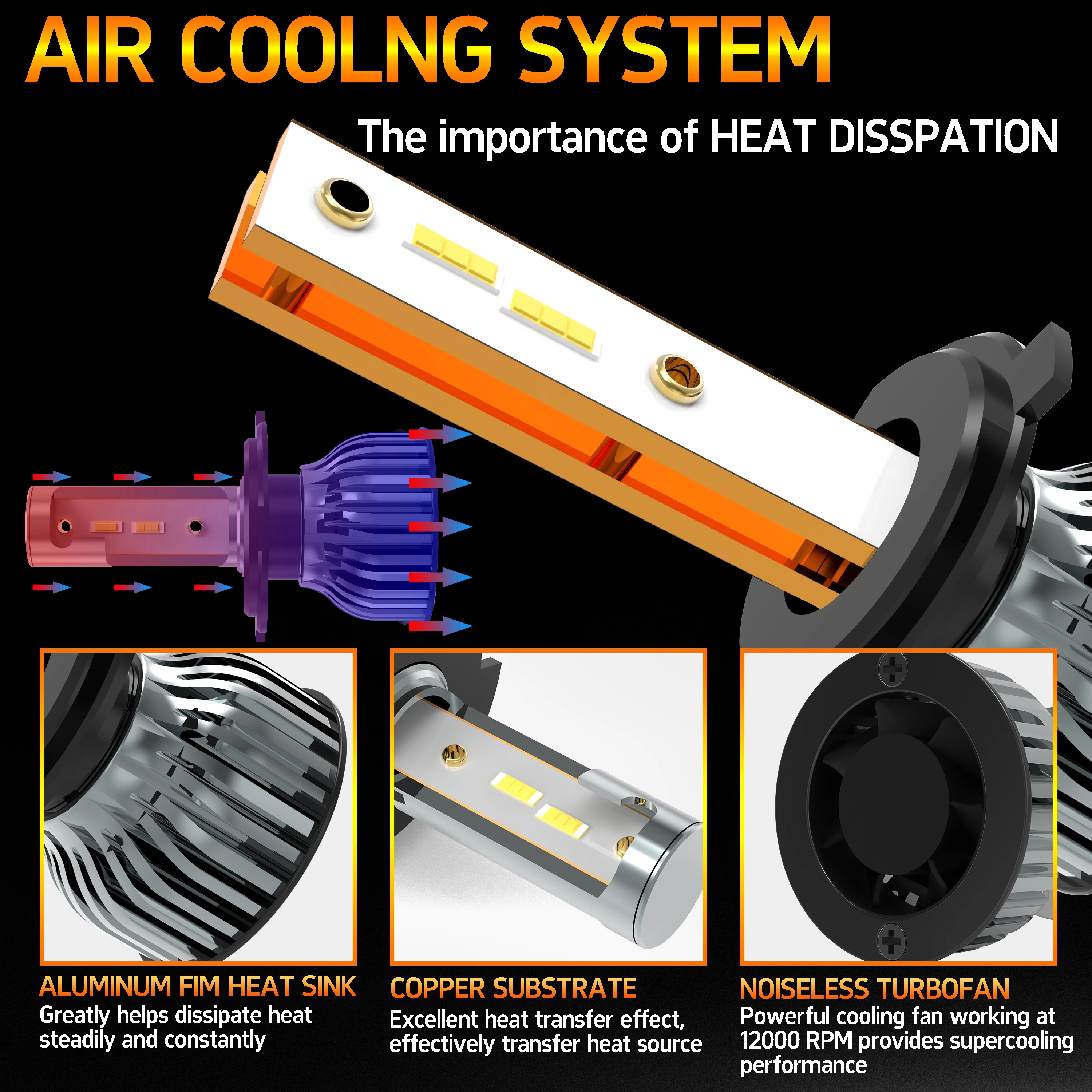 Sistema de resfriamento com potente ventilador turbo com 13.000 RPM, resfriamento rápido, mantém iluminação super longa.