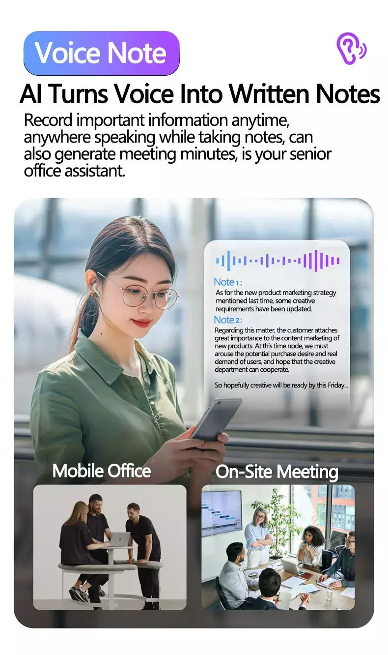 Comunicação cara a cara, tradução imediata, não há dificuldade na comunicação no exterior.Voz em texto com IA, registre informações importantes a qualquer hora, em qualquer lugar, com uma taxa de precisão de até 99%.