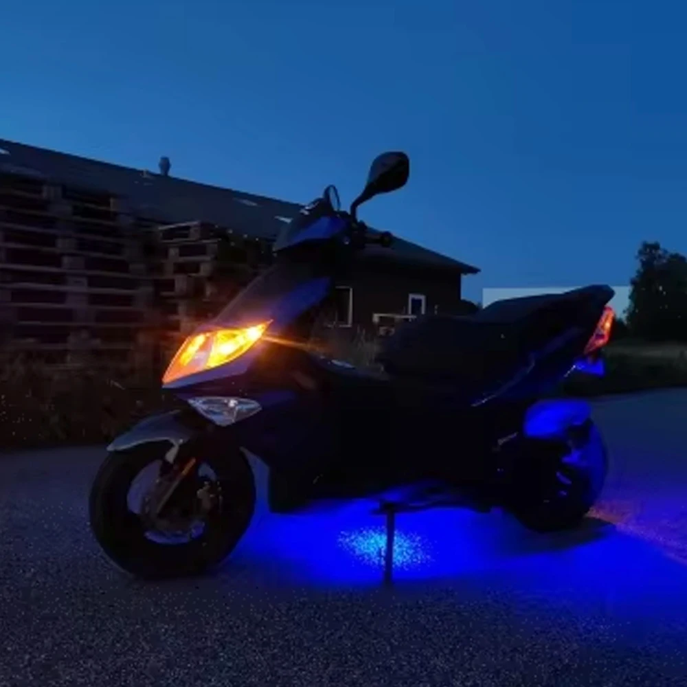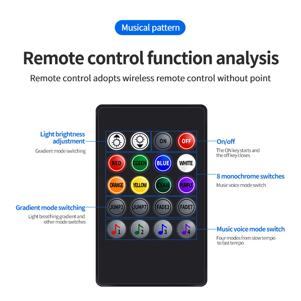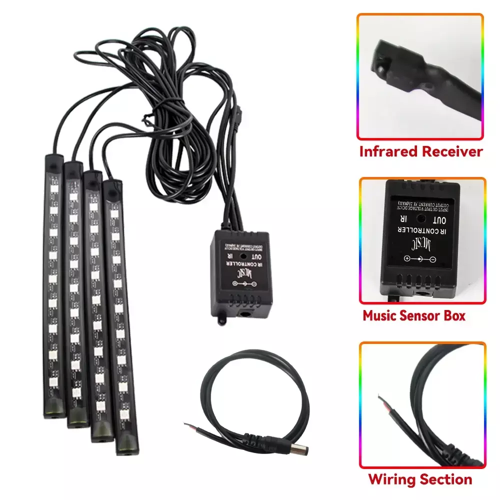 Nome do produto: Luzes decorativas para carro de motocicletaMaterial: ABSCor da luz: RGBÀ prova d'água: IP65Tipo de LED: 5050 SMDTensão de trabalho: 12VModos: Cor estática/pisca/respiração/estroboscópicoControle: aplicativo móvel/controle remoto