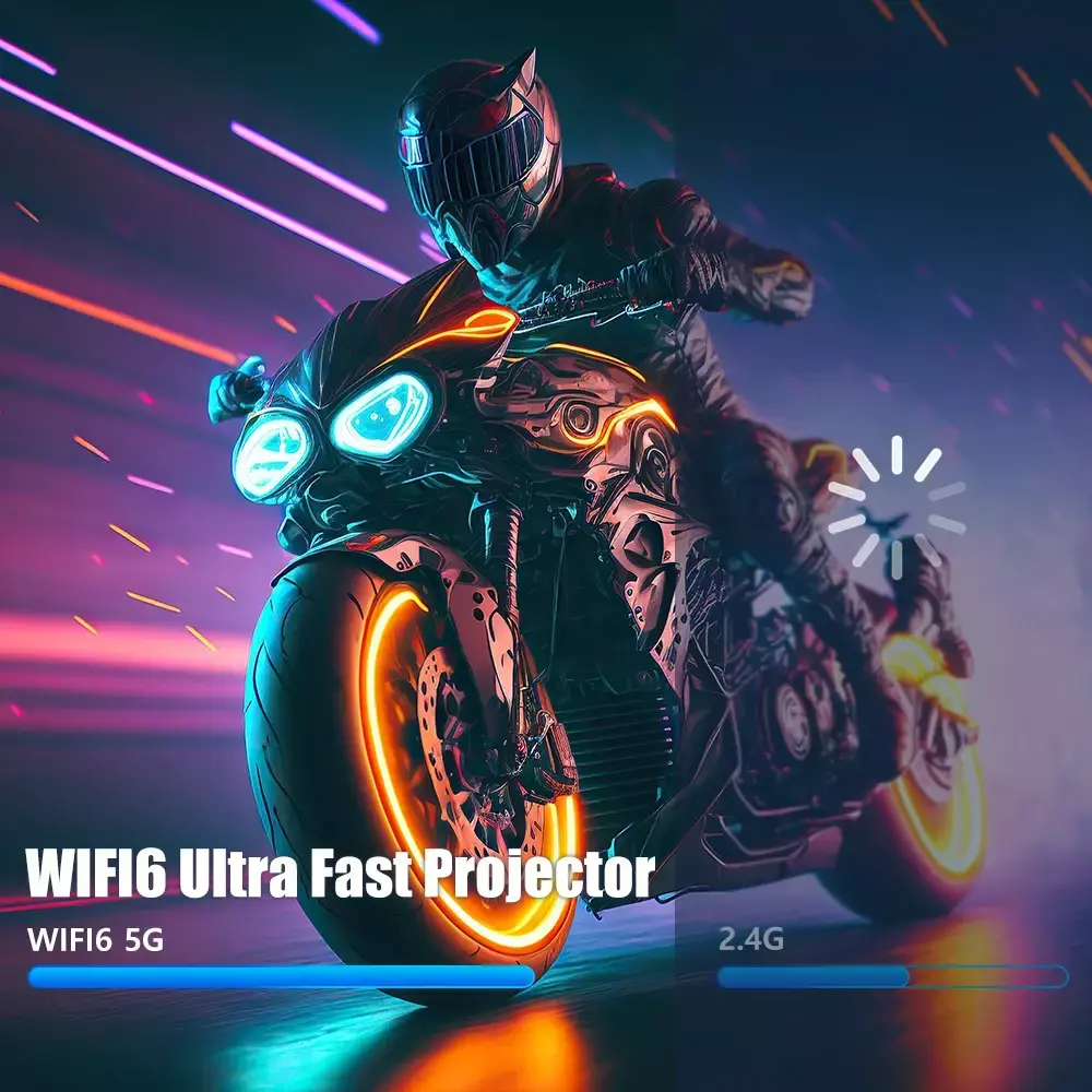O projetor usa líder da indústriaWiFi 6Tecnologia, a transmissão é mais rápida e mais estável, desfrute de uma visualização suave e experiência de jogo! Você pode espelhamento de tela sem fio através de Miracast e Airplay