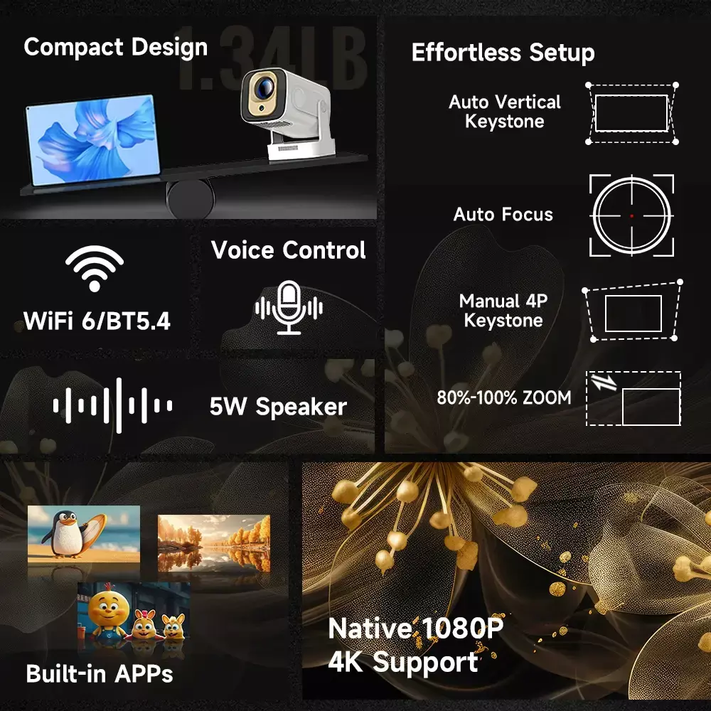 Suporte nativo 1080P e 4K e 330 ANSI e foco automático e taxa de lançamento 0,8:1