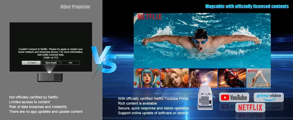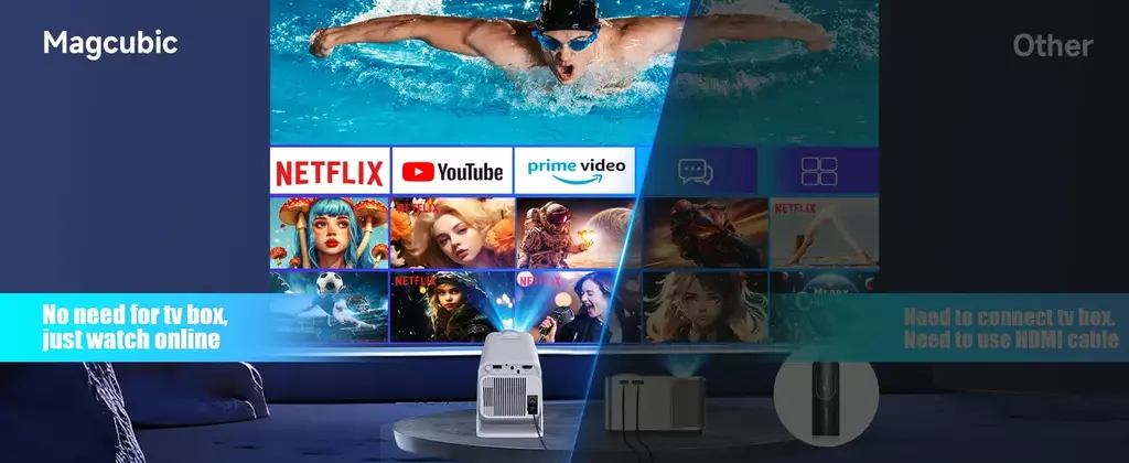 Projetor Magcubic com sistema operacional integrado que suporta mais de 1.000.000 de vídeos, incluindo Netflix, Prime Video e YouTube certificados.Com apenas um clique, você pode desfrutar rapidamente de seus filmes e programas de TV favoritos sem comprar um stick de TV adicional.