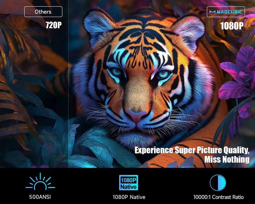 Com resolução nativa de 1080P, brilho de 500 ANSI, alta relação de contraste dinâmico de 10000:1, o projetor Magcubic é pelo menos 95% mais brilhante e claro do que outros projetores 1080P.Ele oferece alta clareza, contraste e cores ricas para cada detalhe exibido.Seja de dia ou de noite, em casa, ao ar livre ou em reuniões de negócios, desfrute da alegria máxima da projeção a qualquer hora e em qualquer lugar.