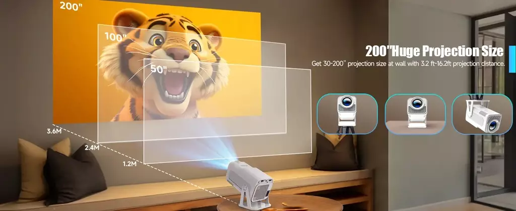 Tamanho de projeção recomendado 30-200 polegadas, proporção de projeção 1,1:1