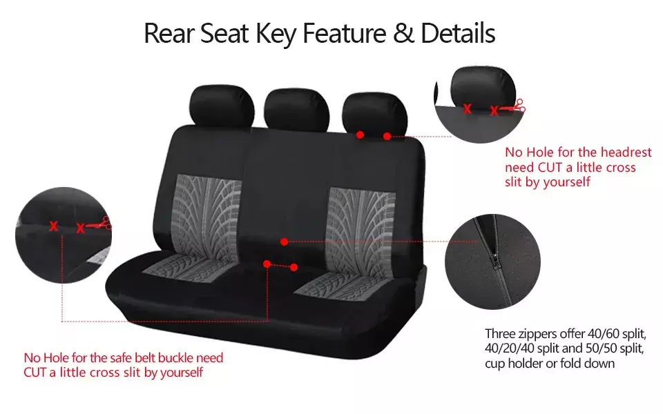 nossas capas de assento têm uma elasticidade, as capas de banco traseiro têm três zíperes para acomodar divisão esquerda e direita 40/60, divisão 40/20/40 e divisão 50/50.Ele também permite que você dobre o porta-copos ou apoio de braço, descompactando um dos zíperes na capa do encosto. Ajuda você a expandir ou encurtar facilmente a capa de acordo com o modelo do seu assento de carro.