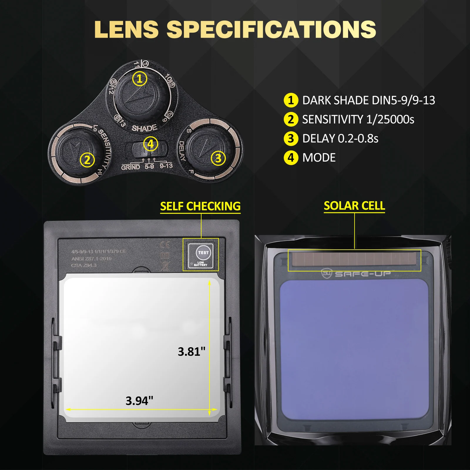 A função de escurecimento automático do capacete de soldagem SAFEUP passa do claro ao escuro em 1/25.000 segundos;cristais líquidos de alta qualidade e revestimentos ópticos protegem contra radiação UV e infravermelha, bem como contra o brilho, de acordo com os padrões de proteção DIN5-9/9-13.