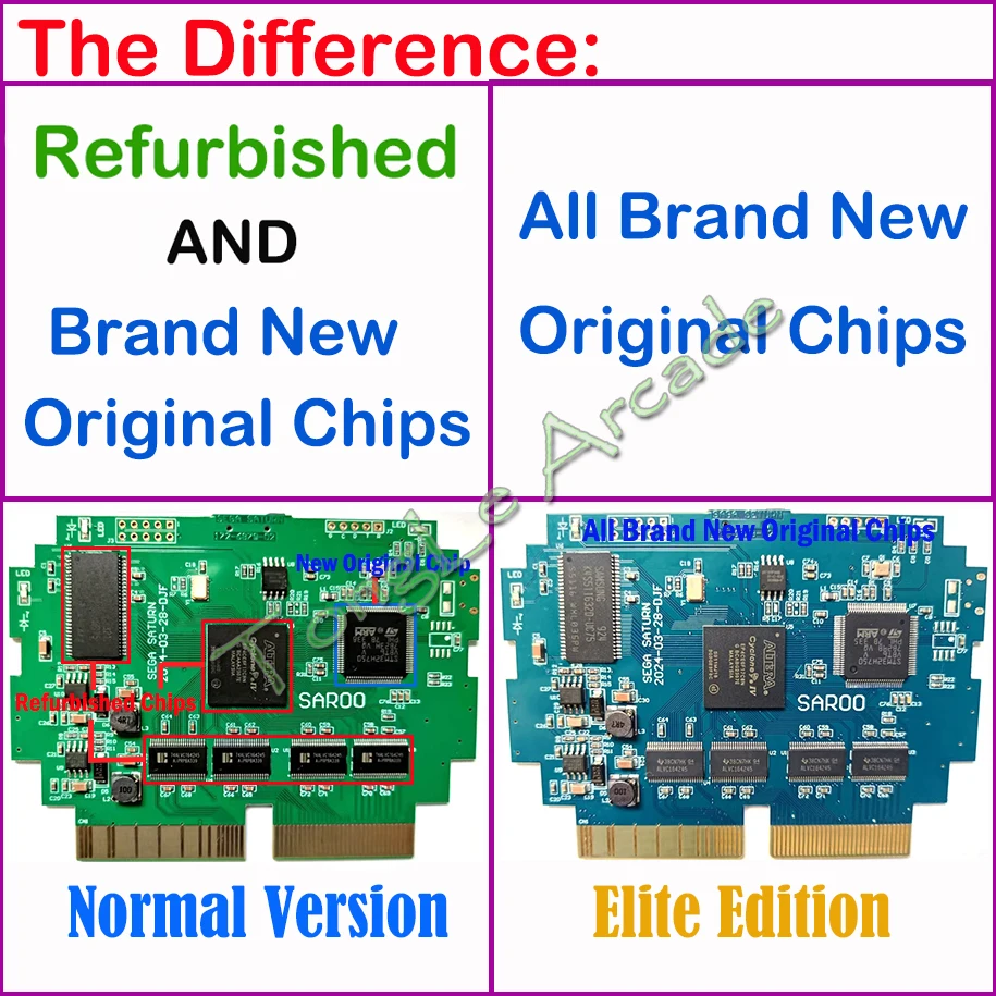 *O Versão normalusa três tipos de chips recondicionados, enquanto o Versão Eliteusa chips originais novos.Não há diferença em outras versões.A placa de circuito azul é a versão elite e a placa de circuito verde é a versão normal.Os cartões SAROO que você vê no mercado usam chips recondicionados de segunda mão e alguns até usam chips de segunda mão para reduzir os preços.Como o preço dos novos chips varia várias vezes, é difícil comprar novos e originais.
