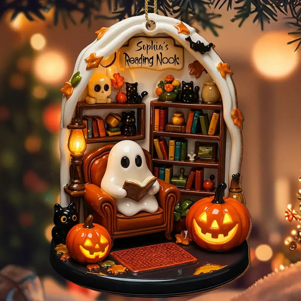 Este enfeite de leitura de Halloween é feito de material acrílico grosso e apresenta um design gráfico 2D.O formato geral é um porta-livros, com bordas polidas, lisas e sem rebarbas.O padrão é claro, o contorno é distinto do livro, e a cor é principalmente, apresentando uma atmosfera sagrada.