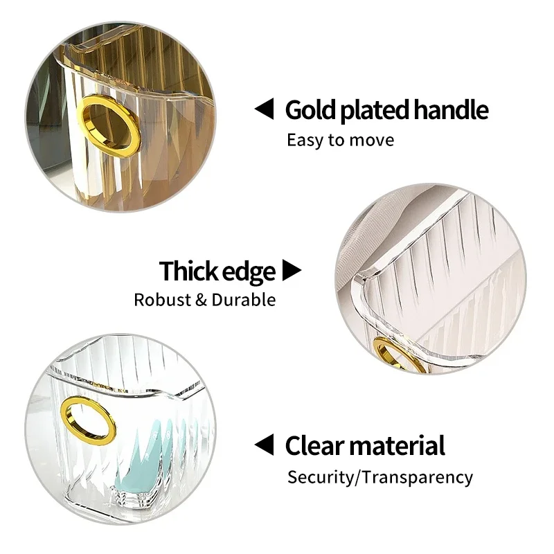 2.Design: Esta caixa de armazenamento com textura de diamante tem um design transparente, você pode ver claramente os itens na caixa e encontrar seu local de armazenamento, evitando o trabalho de vasculhar.Existem duas alças laterais leves e luxuosas com bordas douradas, que podem ser movidas ou transportadas com você à vontade.