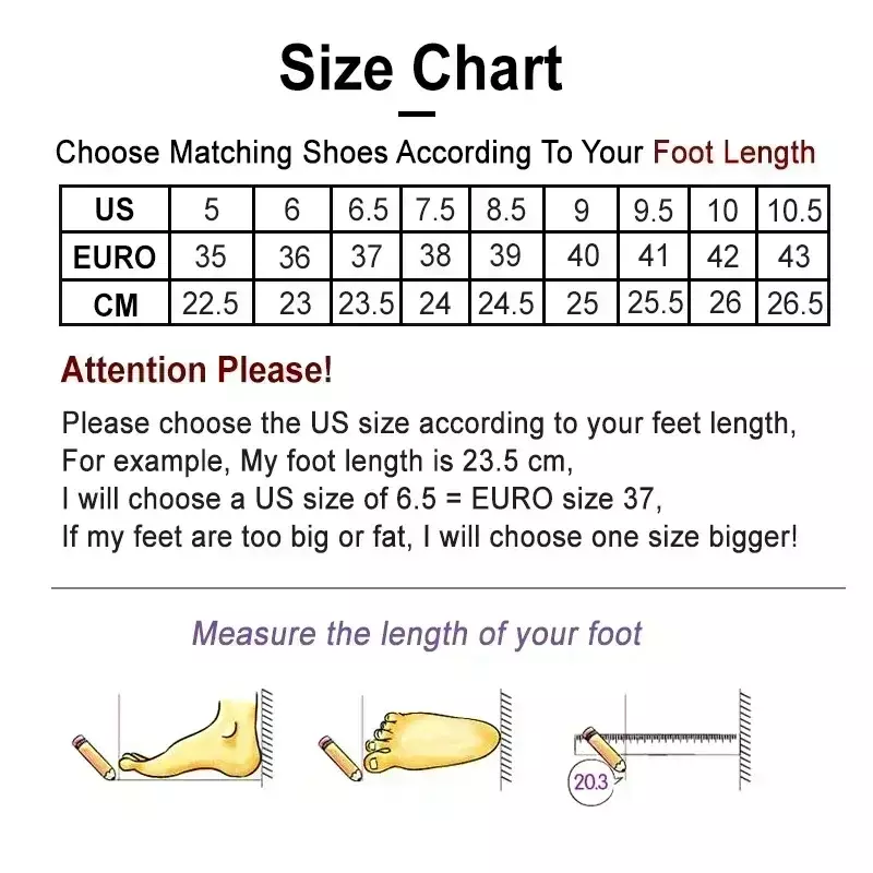 1. o tamanho dos eua ou eur pode ser diferente do seu país, então escolha o tamanho europeu de acordo com o comprimento do seu pé!