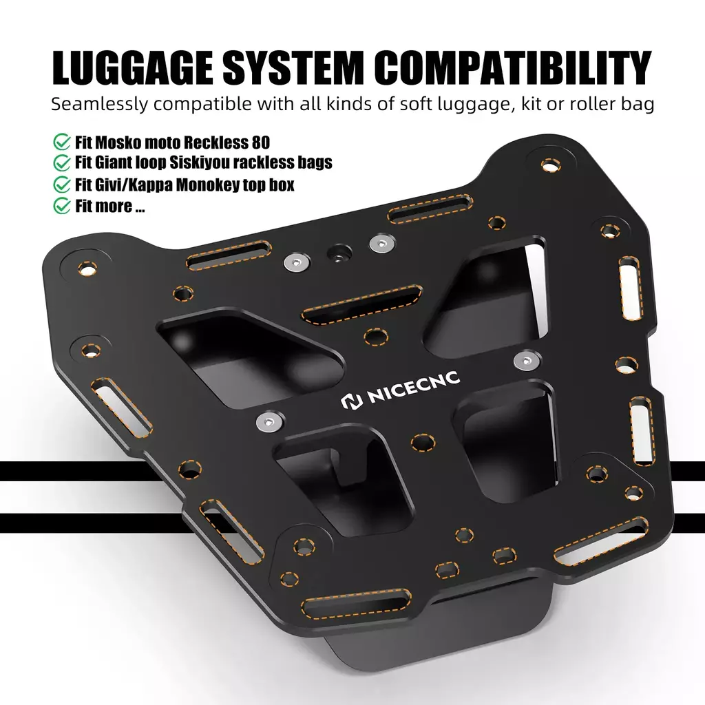 Slots cuidadosamente projetados e orifícios de montagem fornecem compatibilidade perfeita com todos os tipos de bagagem macia, kit ou bolsa de rolo, perfeita para montar bolsas sem rack Mosko moto Reckless 80 ou Magic Loop Siskiyou.Furos pré-perfurados para fácil montagem do top box Givi/Kappa Monokey (somente piloto, sem pílula, somente uso rodoviário, máximo 5 kg)