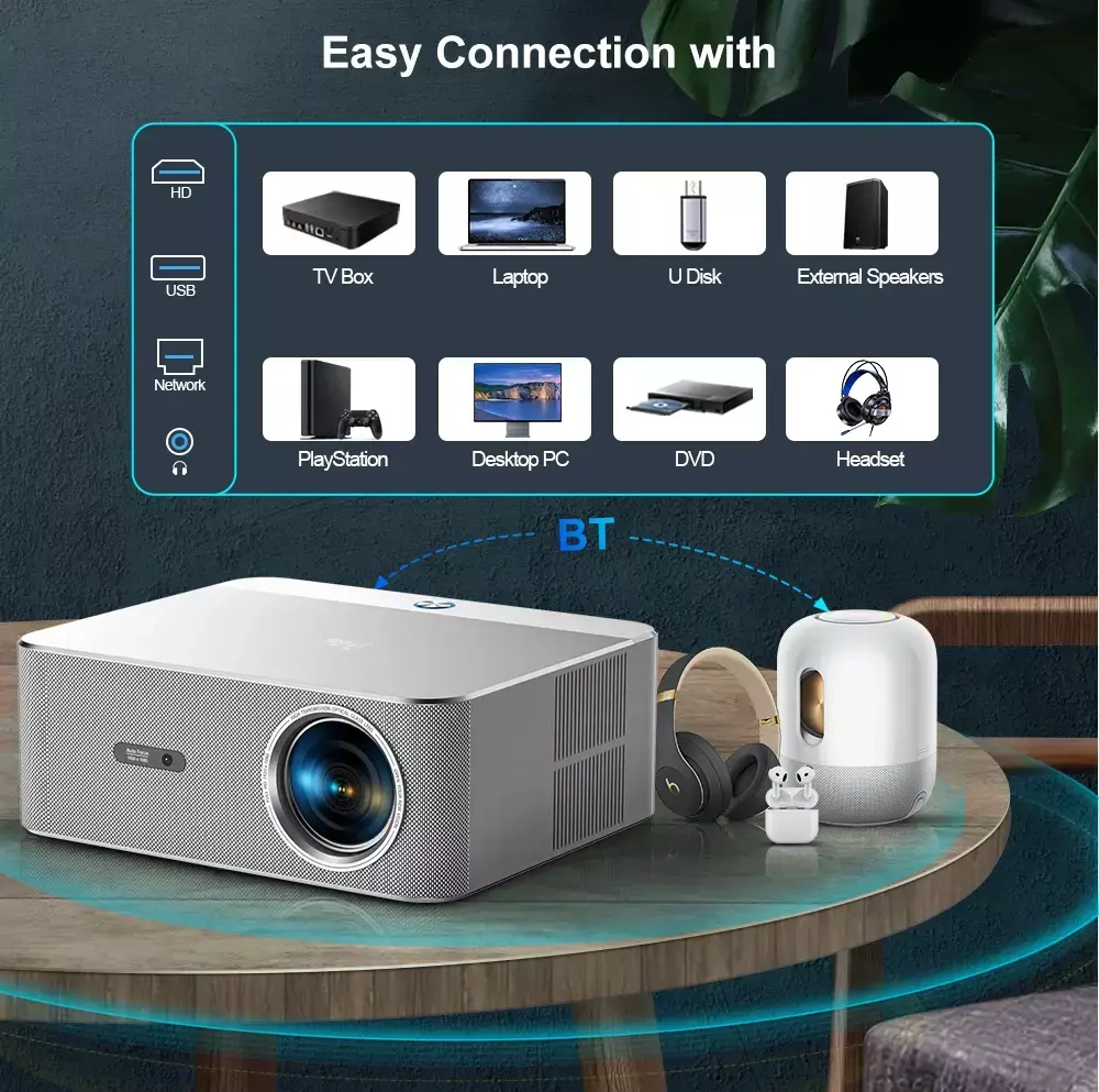 O projetor de vídeo está equipado com alto-falante de 10W, oferecendo detalhes de som ricos e criando 360 envolventes° Som estéreo 3D de alta fidelidade para cenários envolventes de vídeo, música e jogos Diga adeus à distorção do áudio e ao ruído dos alto-falantes.