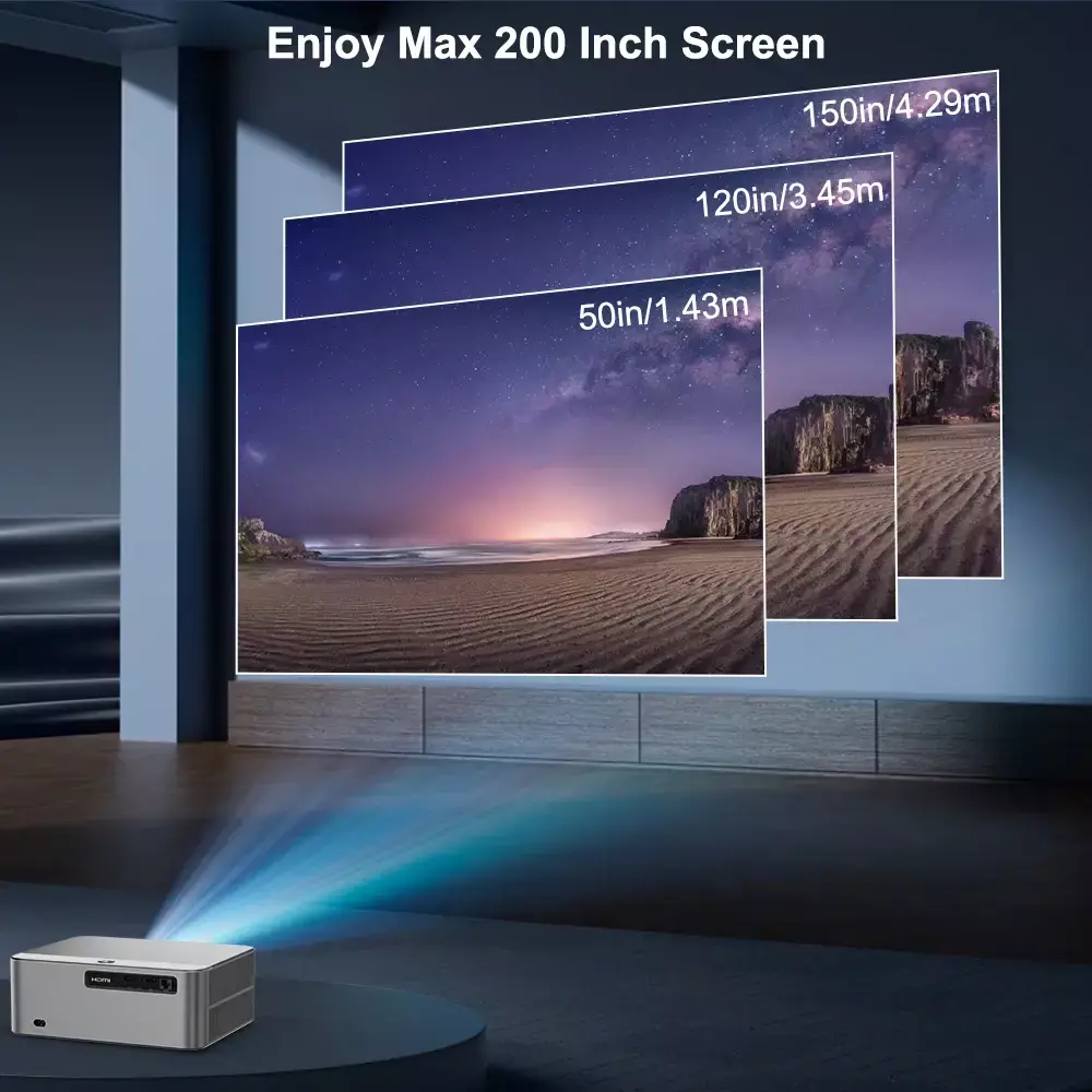 Comparado com a TV fixa de 60 polegadas, o tamanho da tela do projetor pode variar de 40 a 200 polegadas maior, instalando de forma flexível na faixa de 1.3 a 5 m.Sugerimos 3.Distância de projeção de 45 m, tela de projeção de 120 polegadas e escuridão ambiente, que é a melhor proteção para os olhos e aproveita a distância.
