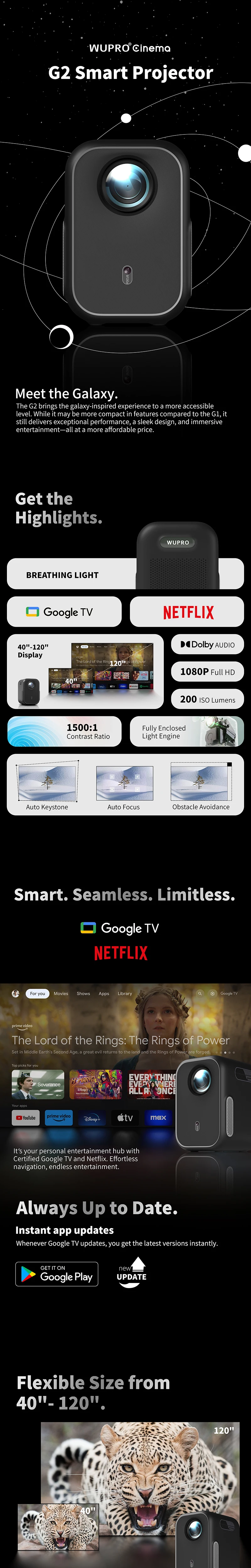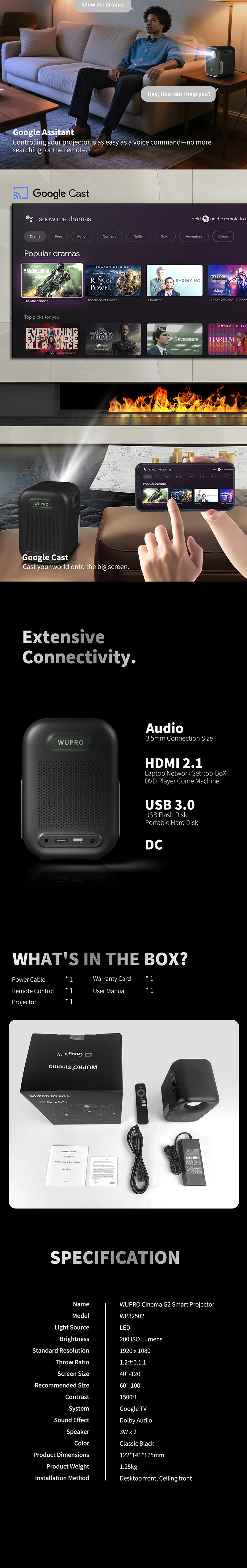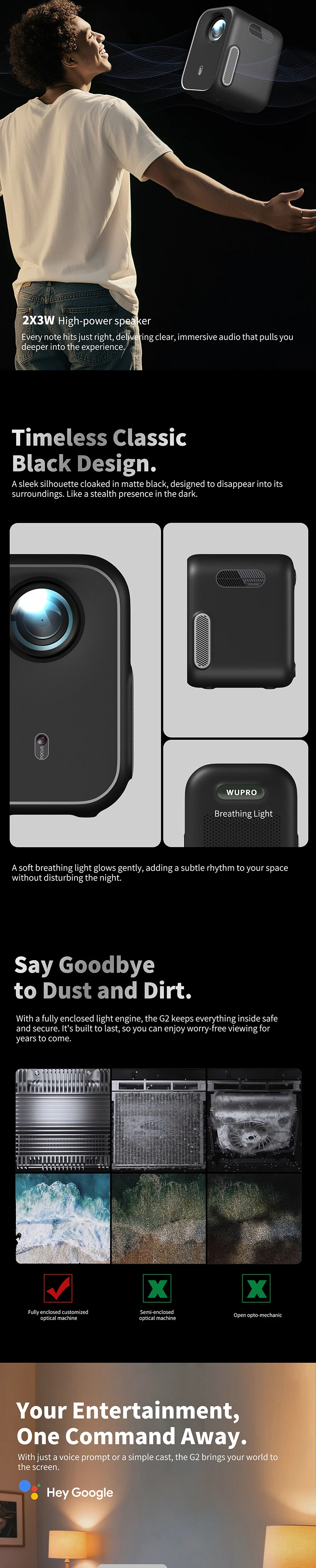 O projetor Wupro G2 compacto e leve foi projetado para fácil portabilidade, perfeito para noites de cinema ao ar livre ou viagens.