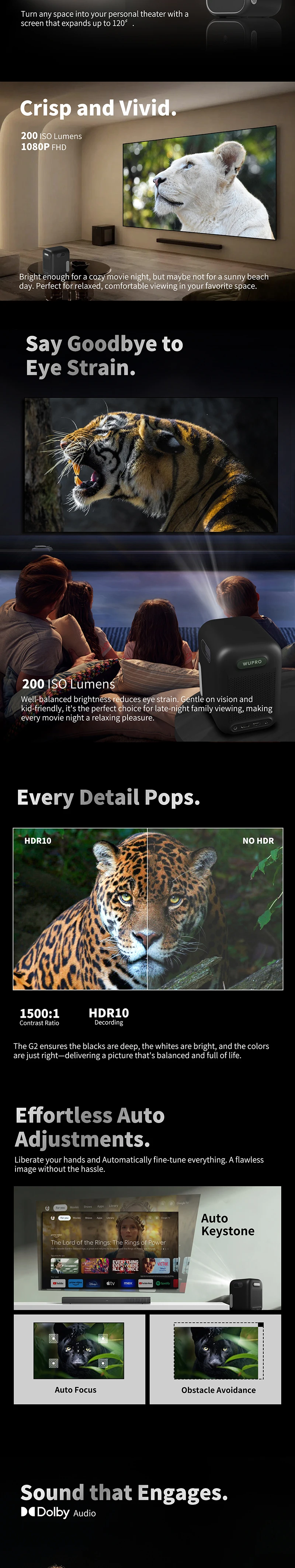 Experimente uma clareza incomparável com a resolução 1920P do projetor Wupro G2, oferecendo uma experiência de visualização cinematográfica em casa.