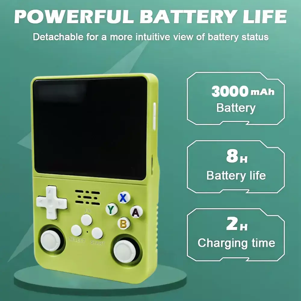 Desfrute de um tempo de jogo prolongado de 7 a 8 horas com o R36S, com uma tela IPS de visualização completa de 3,5 polegadas com resolução de 640x480 para uma experiência de jogo envolvente.