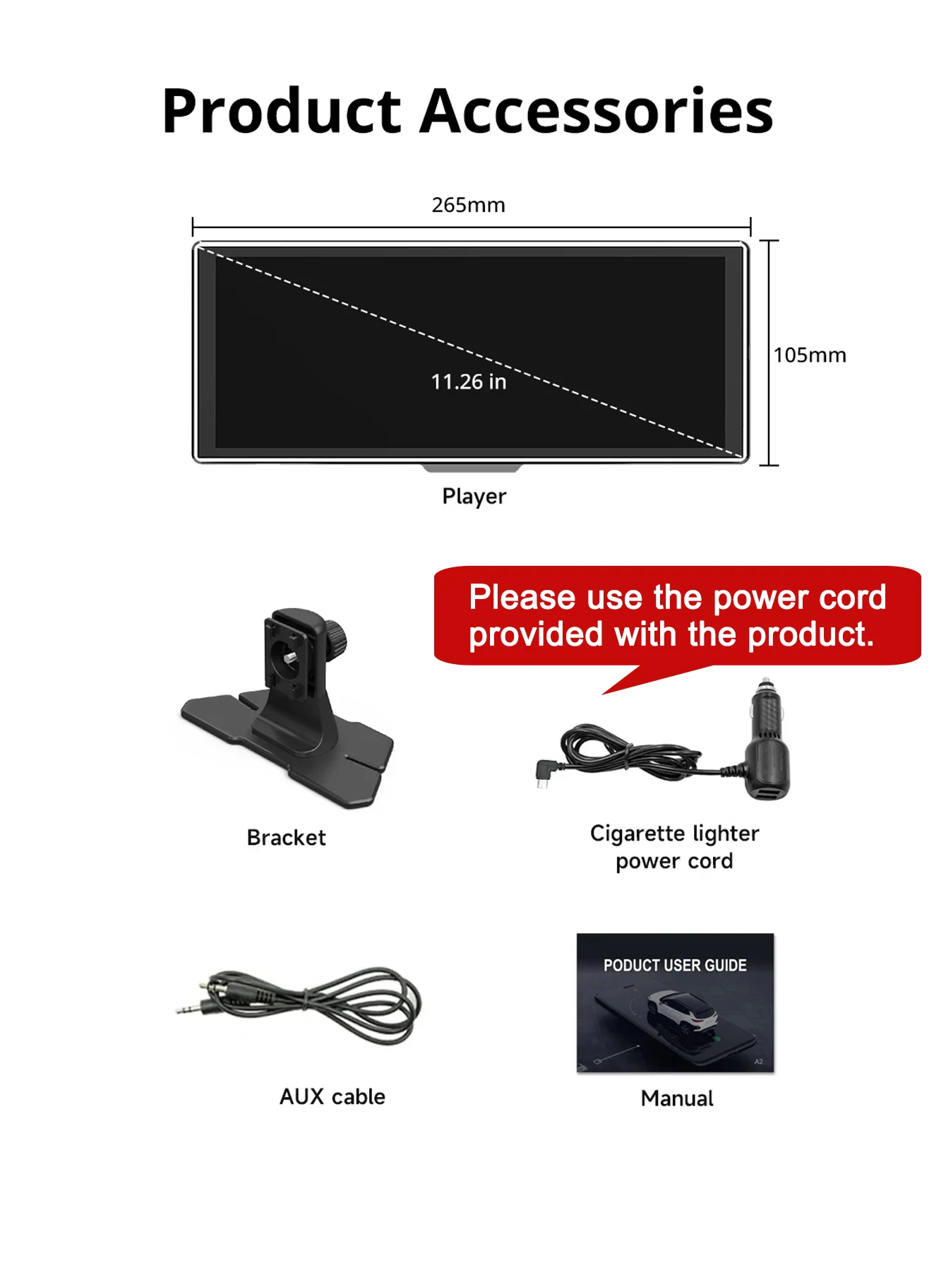 Lista de embalagens: 1 * reprodutor de carro MP5 de 11,26 polegadas 1 * Função de visão reversa (câmera AHD opcional) 1 * cabo A 1 * Suporte de instalação 1 * Isqueiro cabo de alimentação 1 * Manual