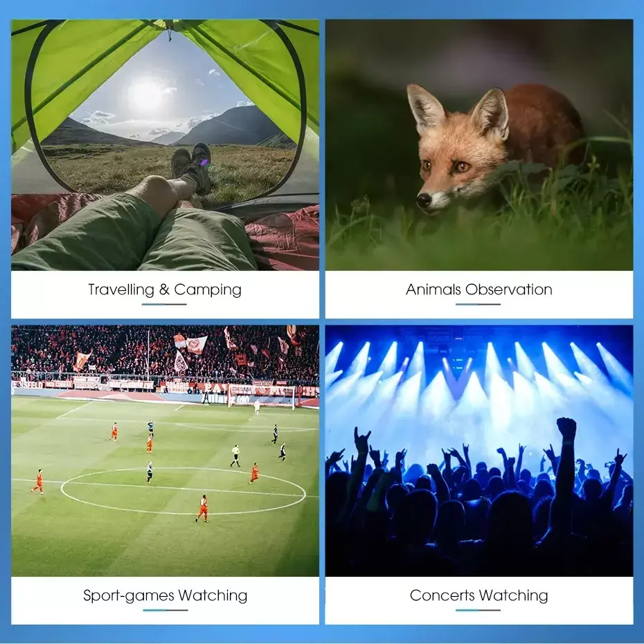 Ampliação de potência 8X e grande campo de visão: 378ft a 1000yds, especialmente projetado para atividades ao ar livre, como escalada, caminhadas, condução, observação da vida selvagem e paisagens. Este poder também pode ser usado para assistir grandes peças de palco, concertos vocais, jogos esportivos, etc.