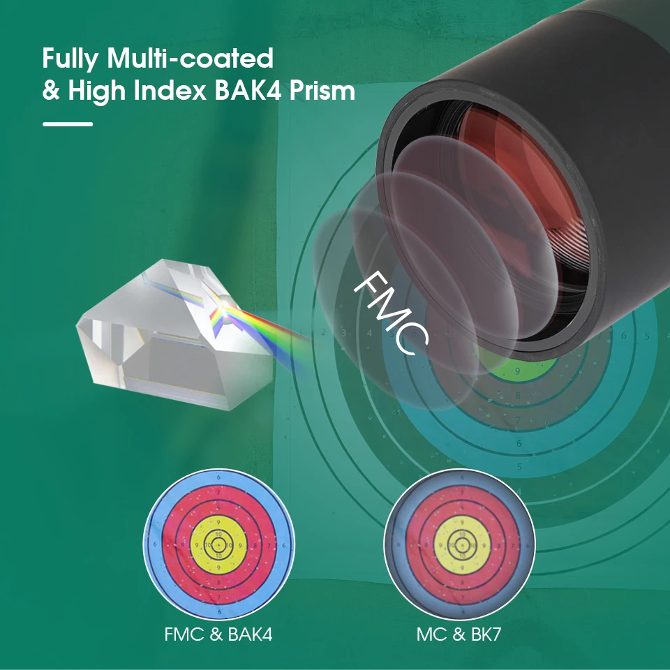 O prisma FMC BAK4 permite que mais luz entre na lente objetiva, fornecendo imagens mais claras e brilhantes.