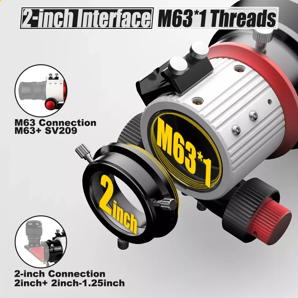 O refrator SV550 é compatível com acessórios de 2 polegadas e M63*1.A frente é um adaptador de 2 polegadas para conectar uma câmera ou acessórios de 2 polegadas; Girando o adaptador, aqui rosqueou as roscas M63*1, para conectar o alisador de campo SV209 ou outros acessórios M63*1.