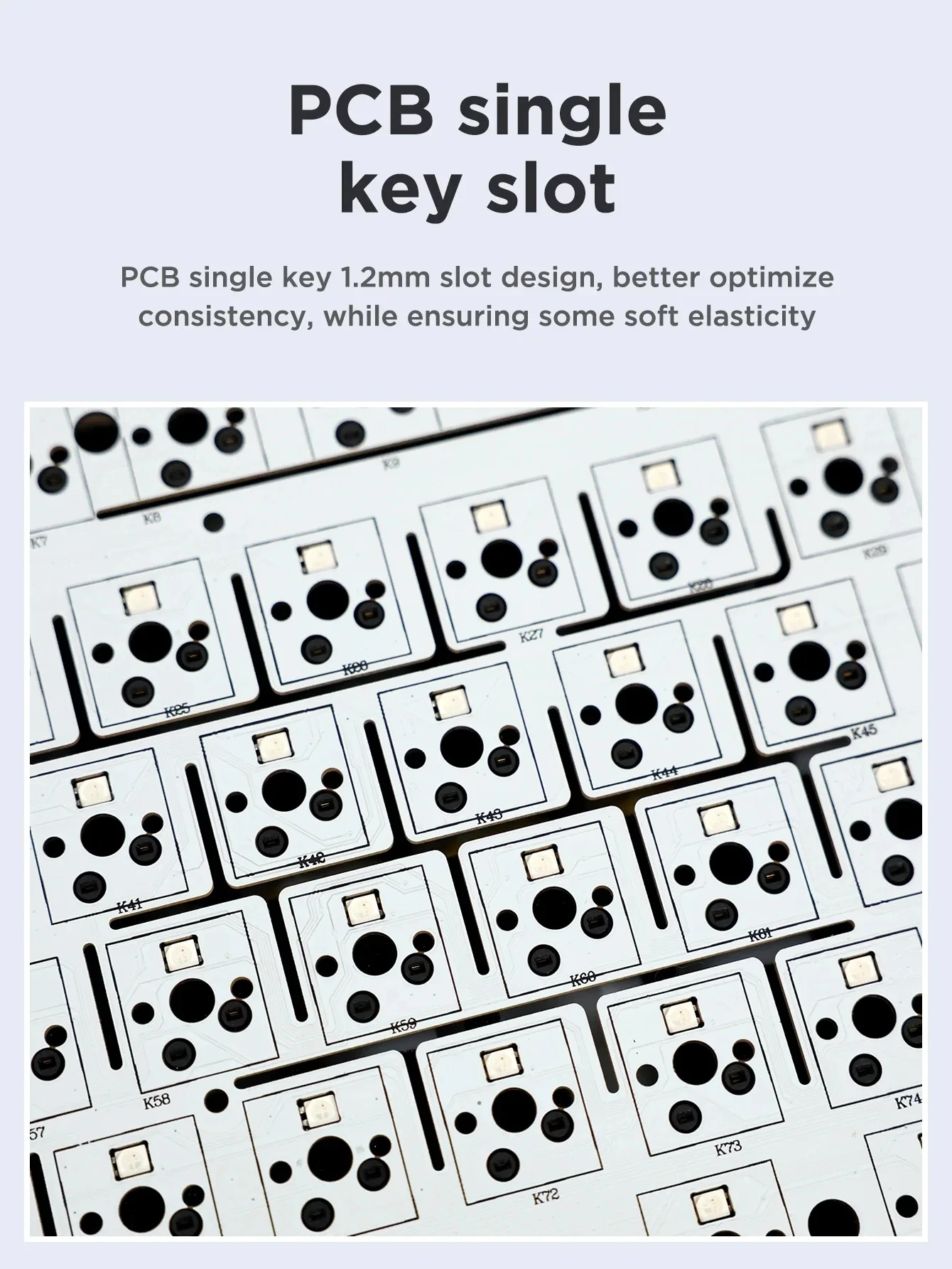 Cinco camadas de silenciamento de preenchimento Preencha a lacuna entre o PCB, a placa de posicionamento e o corpo do eixo, compensa efetivamente o som cavitunda da placa de posicionamento de batida do corpo do eixo, proporcionando uma sensação sólida Estrutura da junta com redução de ruído de 5 camadas: teclado com uma placa de PC e almofadas de silicone premium de 5 camadas e algodão com redução de ruído para reduzir 95% de ruído oco, sobre o ruído de digitação e melhorar o design exclusivo, macio e confortável