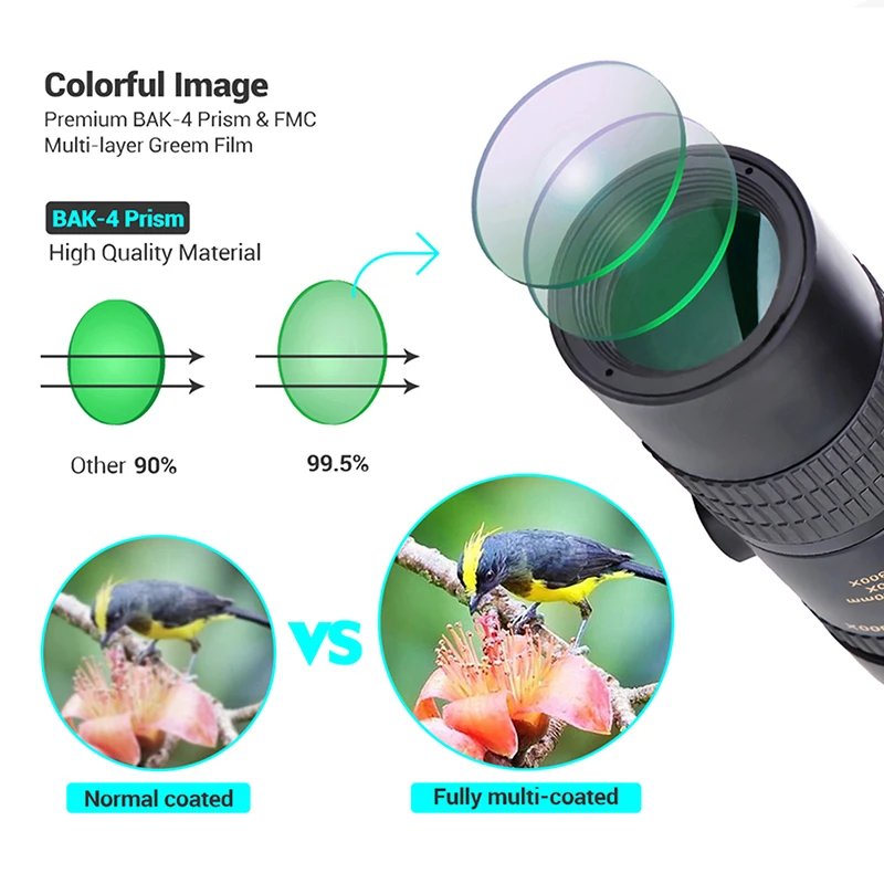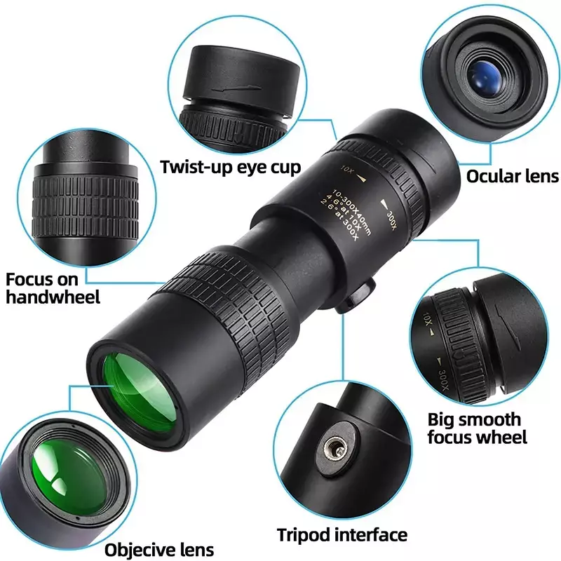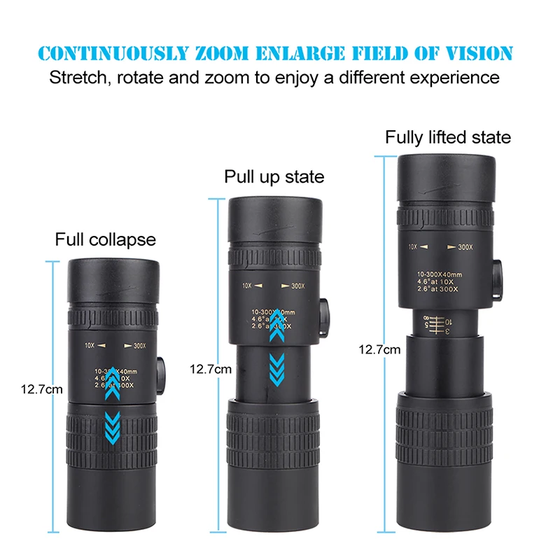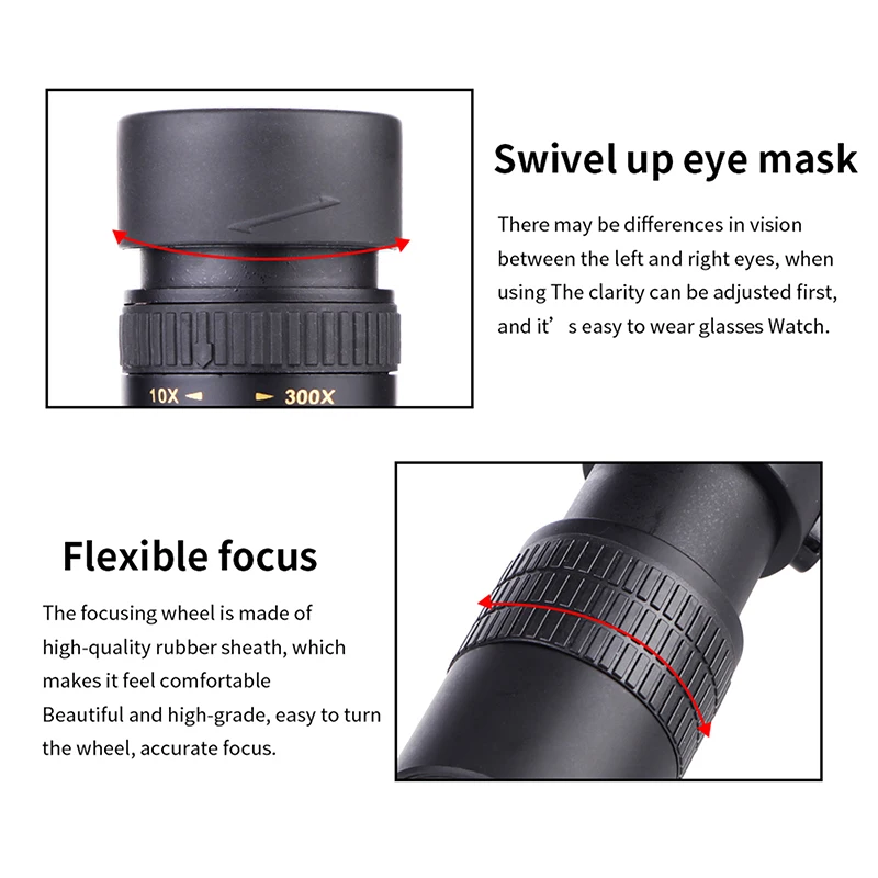*1.Monóculos com ampliação de 300*40, selecionados entre prisma BAK4 e lentes revestidas multicamadas, com índice de refração mais alto que o vidro comum, imagens mais nítidas.