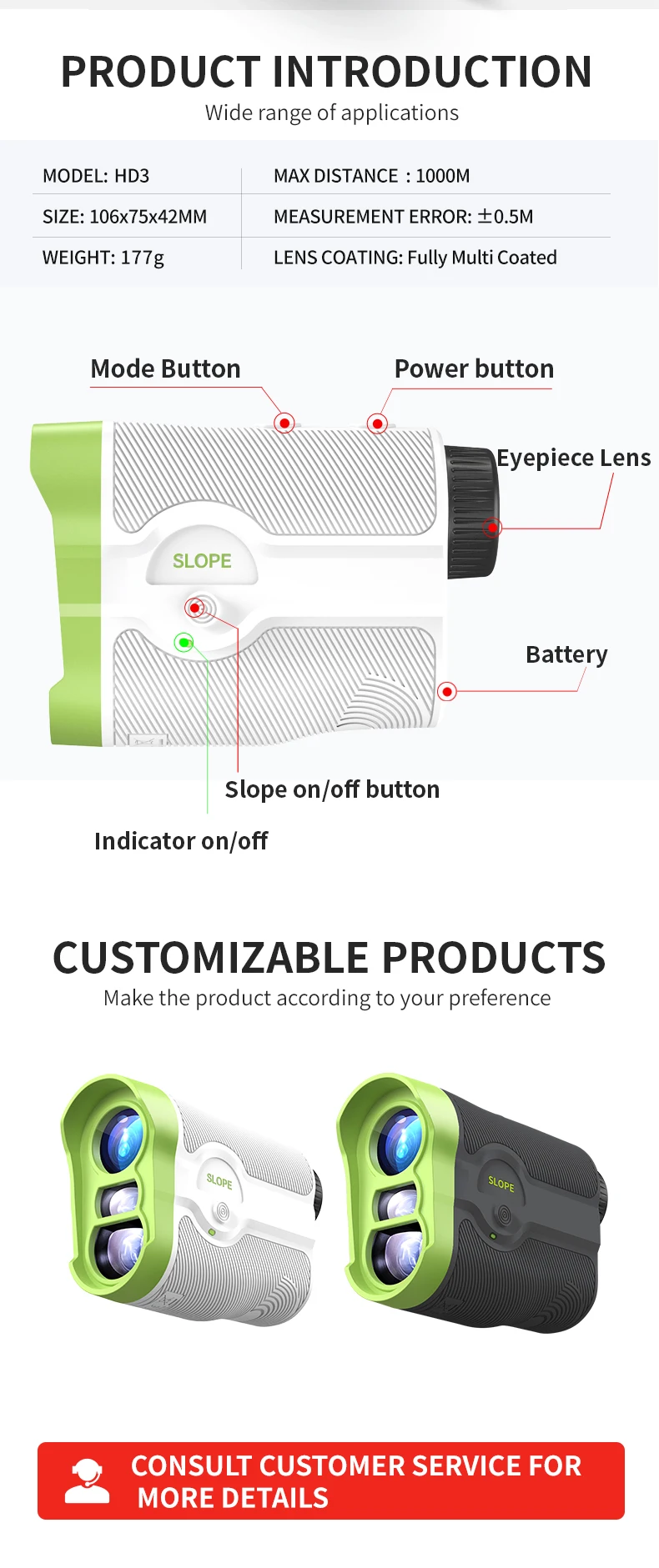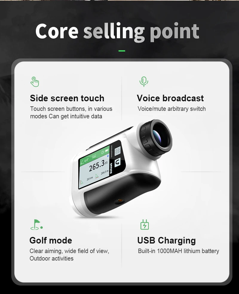 H:Multi-função de alta definição, FA/CL modo mais distante e mais próximo, pode evitar obstáculos e bloquear o alvo, alcance ultra-longo de 2500 metros, ampliação de alta definição 8X, alta precisão ± 0,3 m, recomendado para o mercado de caça, construção, esportes ao ar livre e camping.