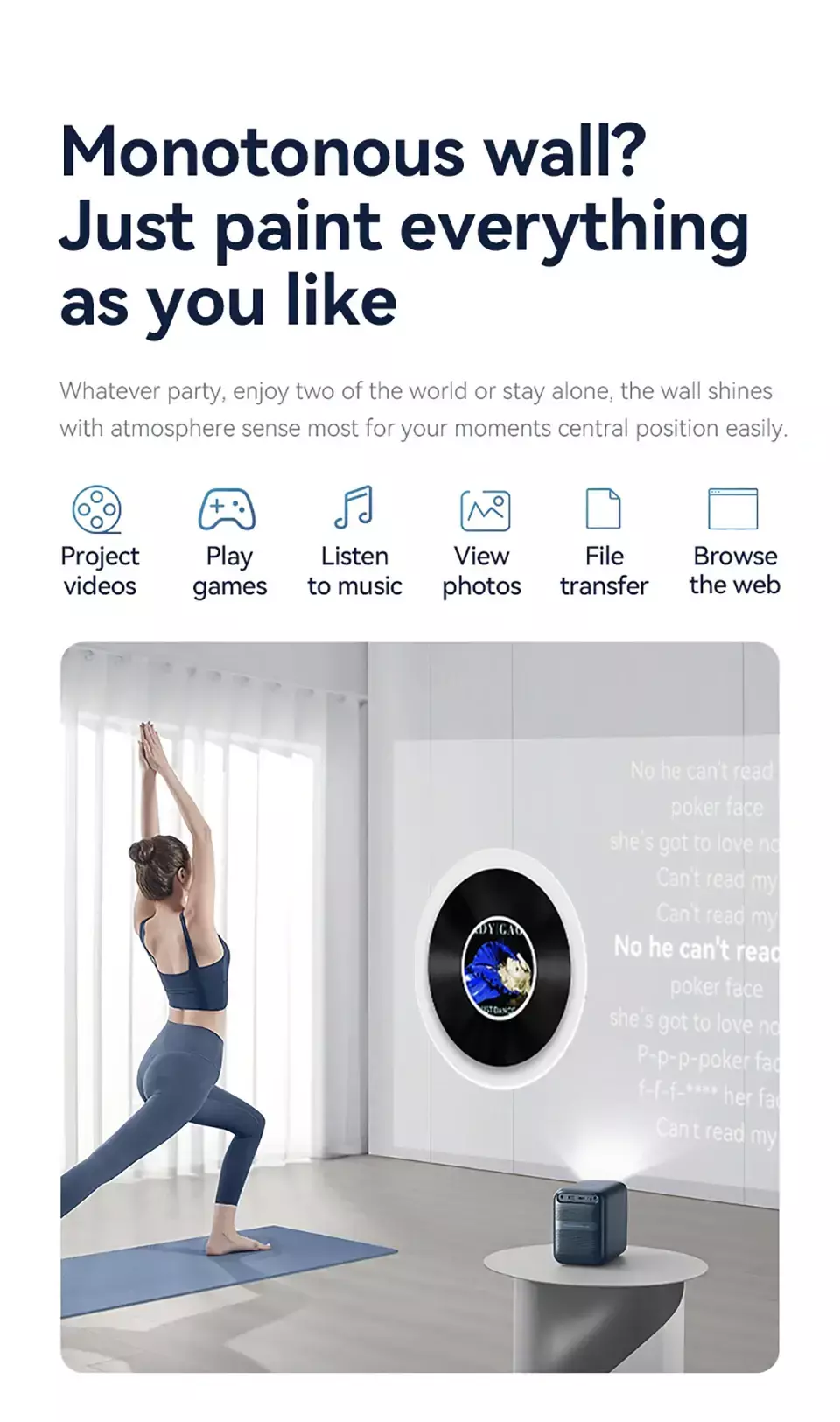 Projetar vídeos, jogar jogos, ouvir música, ver fotos, transferência de arquivos, navegar na web